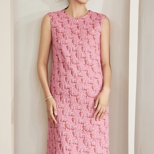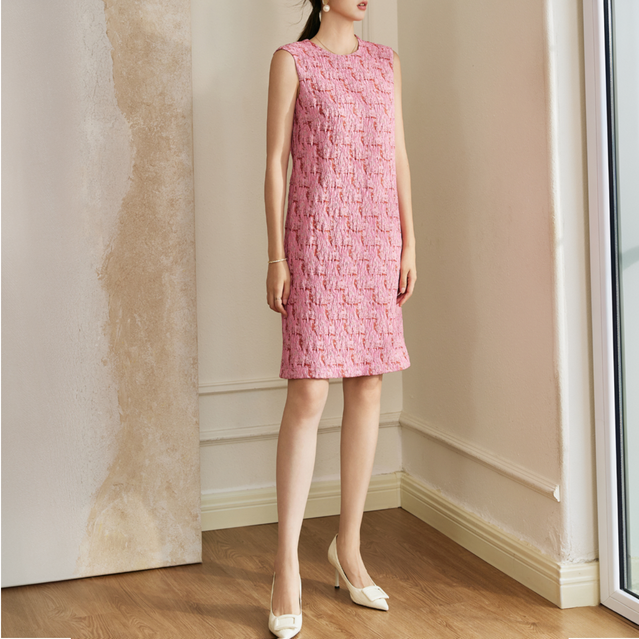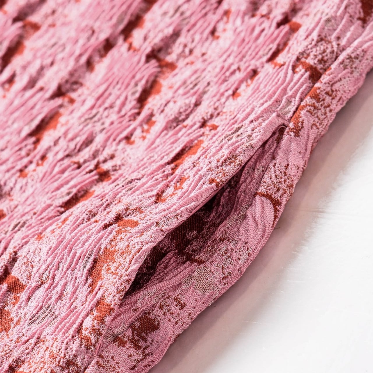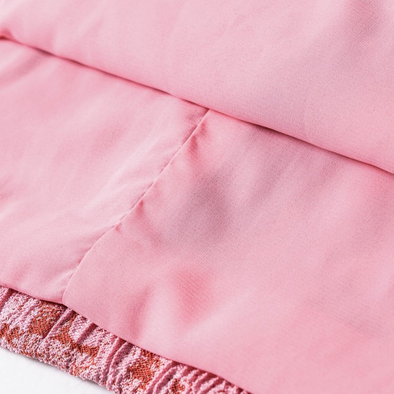 腰丈で洗練されたシルエットが魅力。上品なピンクの柄が、女性らしさを引き立てます。