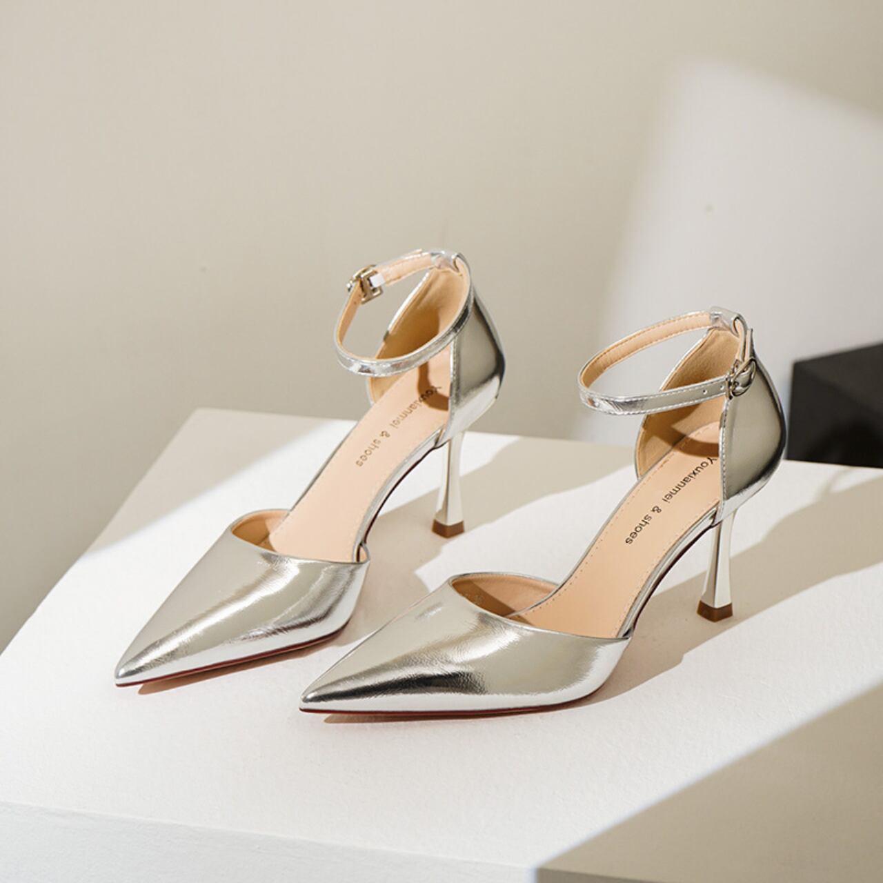 上品さとセクシーさを兼ね備えた、エレガントなスティレットヒール。アンクルストラップ付きで安定感も抜群です。洗練されたシルエットで、どんな装いにも上品さをプラス。パーティーや特別な日の装いに最適です。足元を美しく演出したい方におすすめです。
