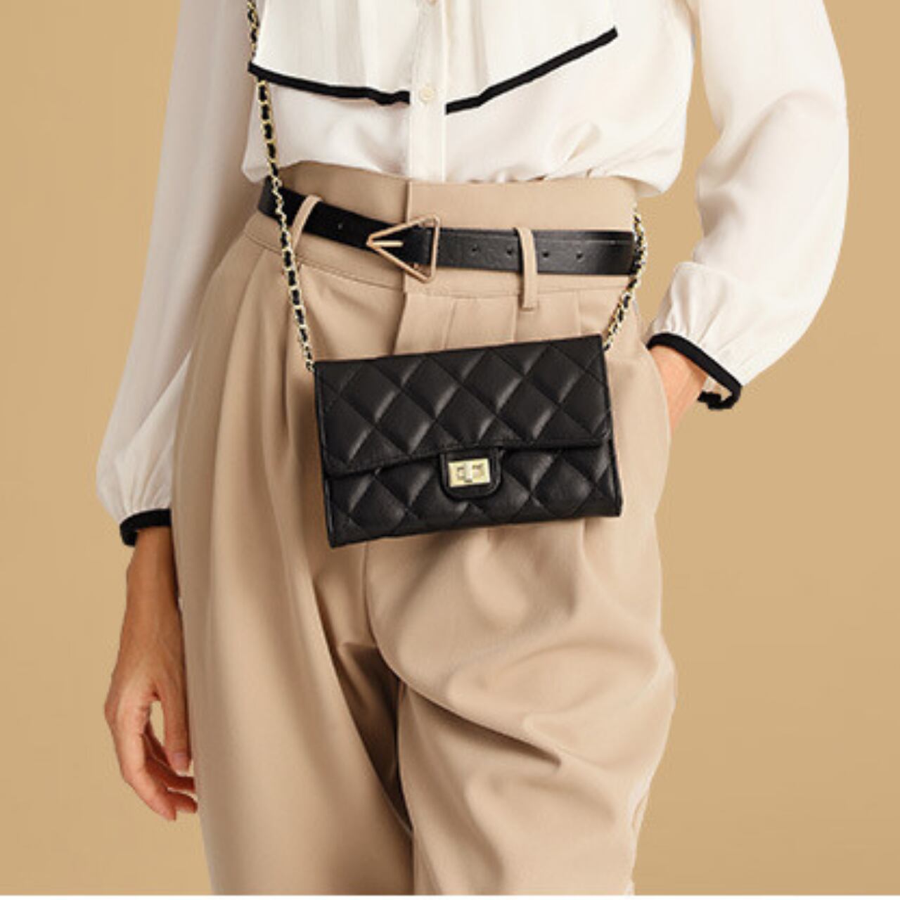 上品な輝きを放つチェーンショルダーバッグ。ゴールドの金具が魅力的なアクセントになっています。コンパクトなサイズながら、財布やスマートフォンなどの必需品を収納できる実用的なデザインです。