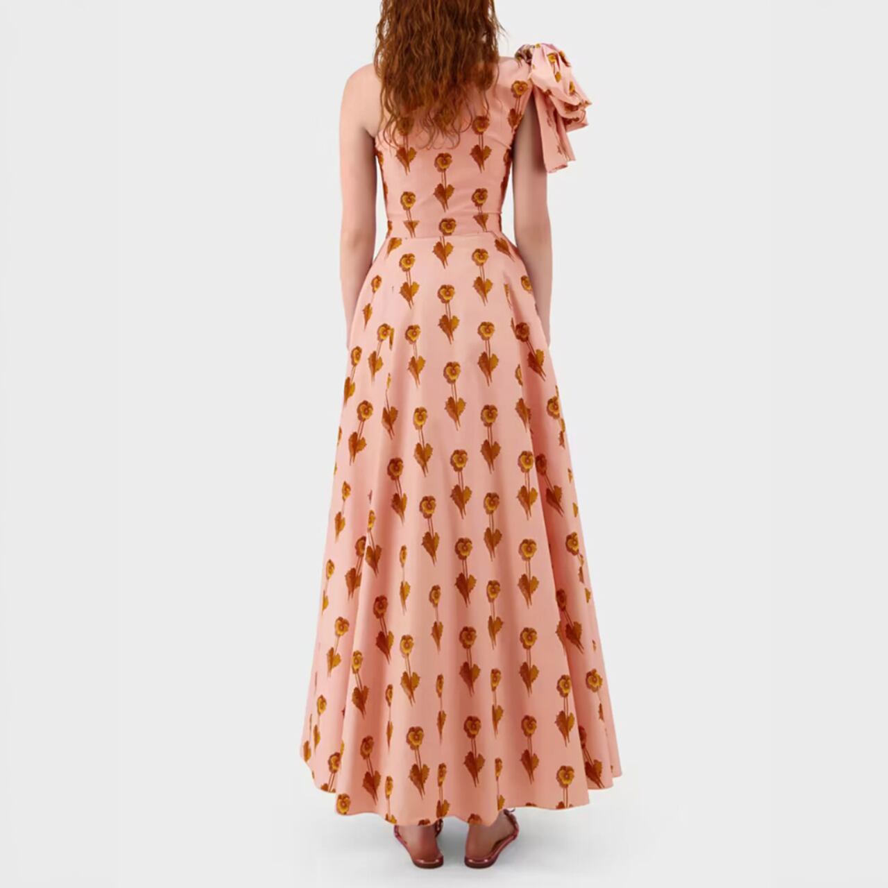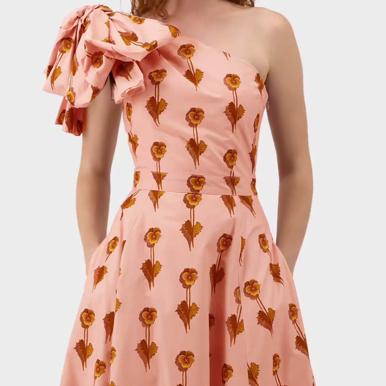 片方の肩に施された大胆なリボンが魅力的。ウエストから裾にかけて広がるシルエットが、女性らしい優美なラインを描き出します。