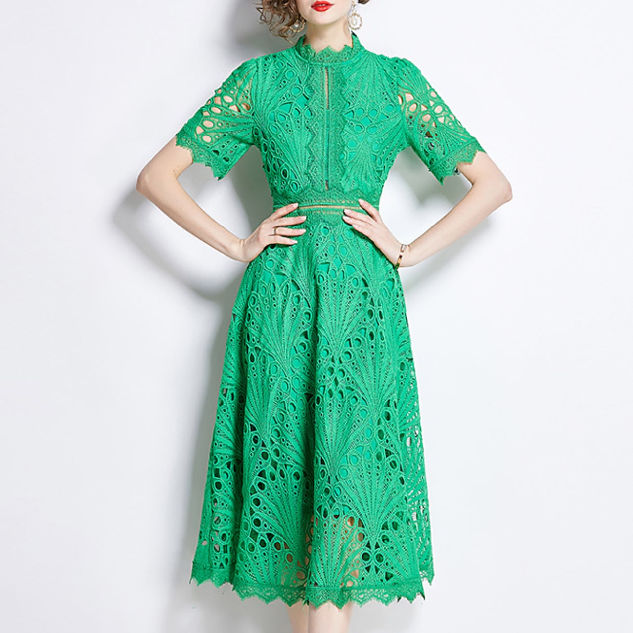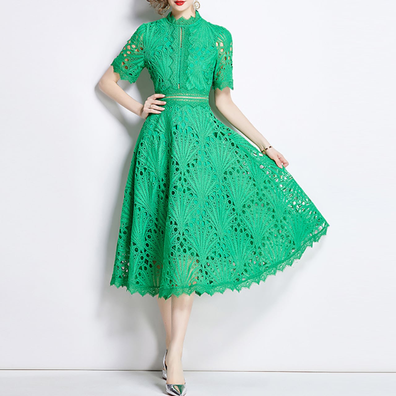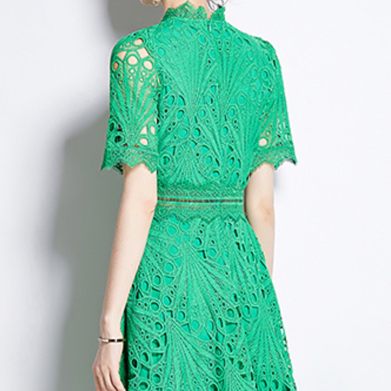洗練されたハイネックと半袖が、大人の女性にふさわしい上品さを醸し出すワンピース。