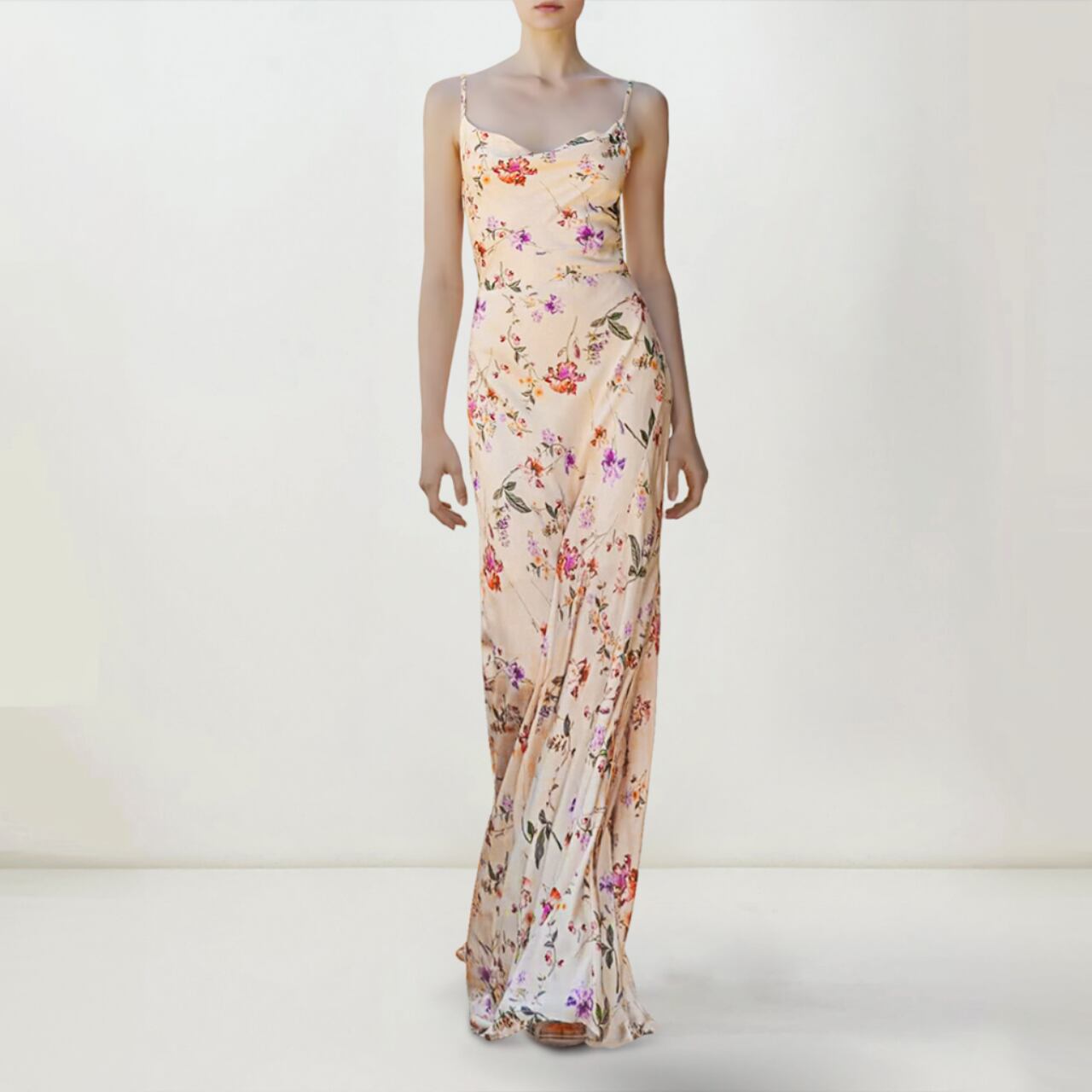 優美なシルエットと繊細な花柄が魅力のキャミソールワンピース。