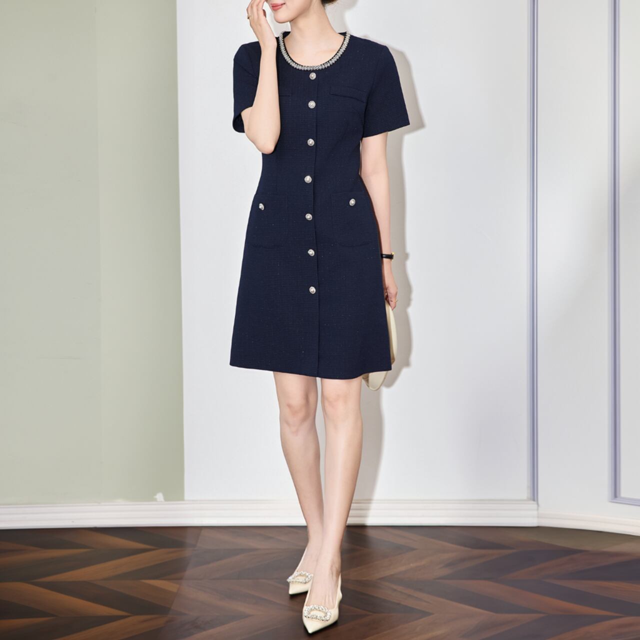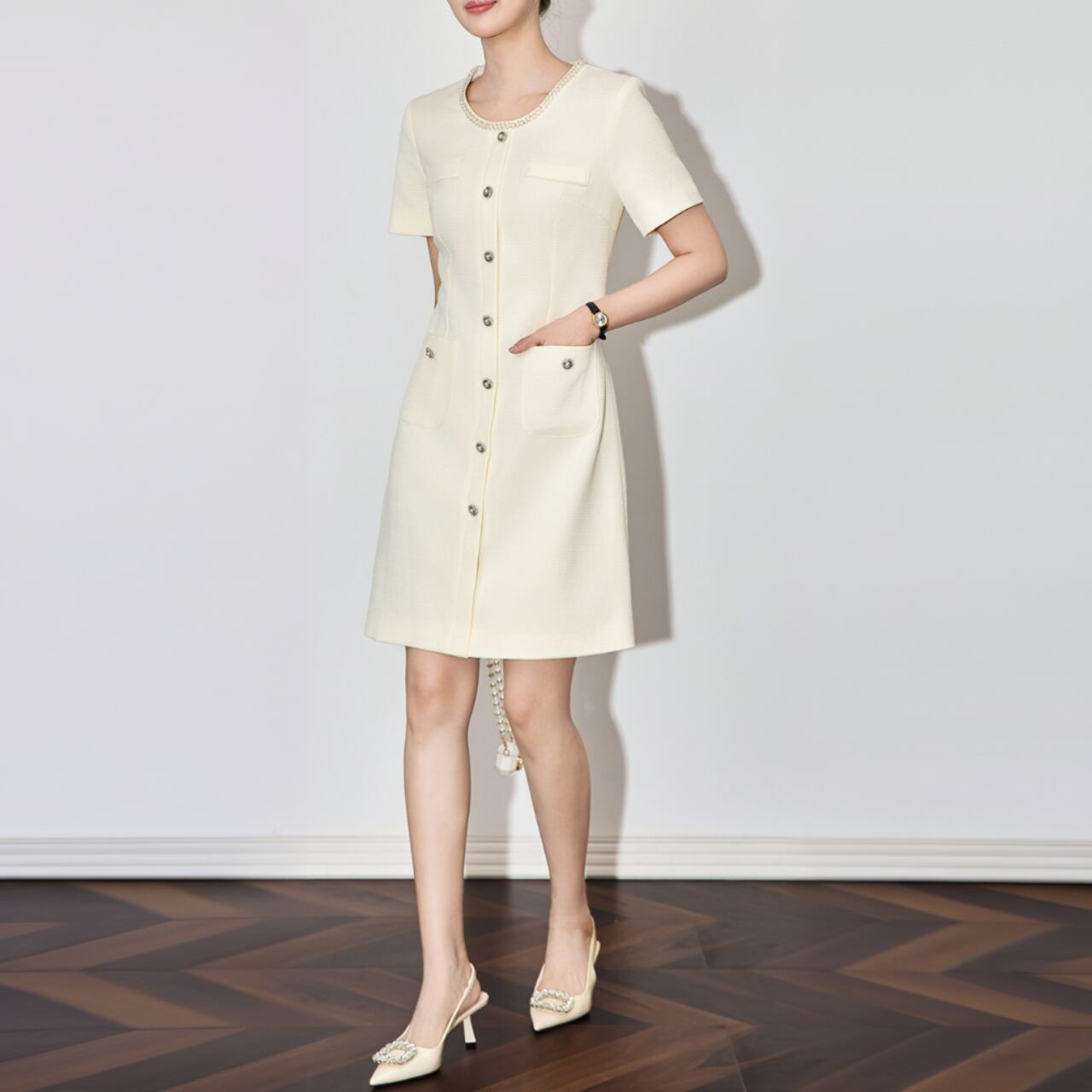 こちらのワンピースは、エレガンスと実用性を兼ね備えた一着です。前面のボタンとポケットのディテールが絶妙にマッチ。