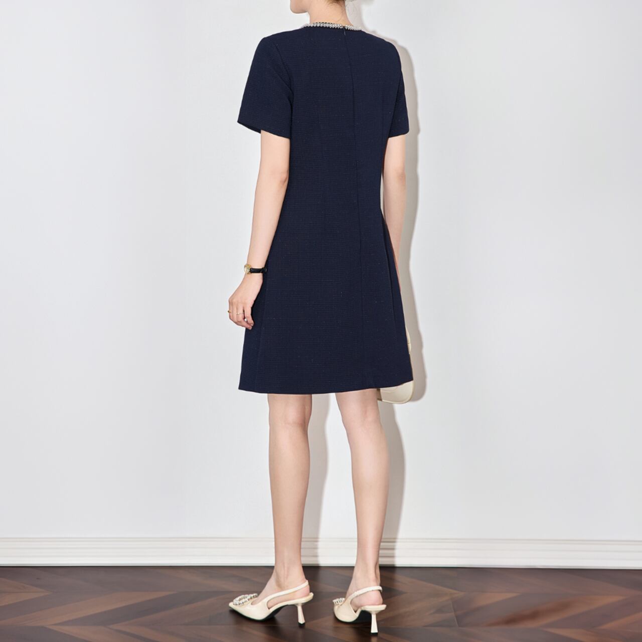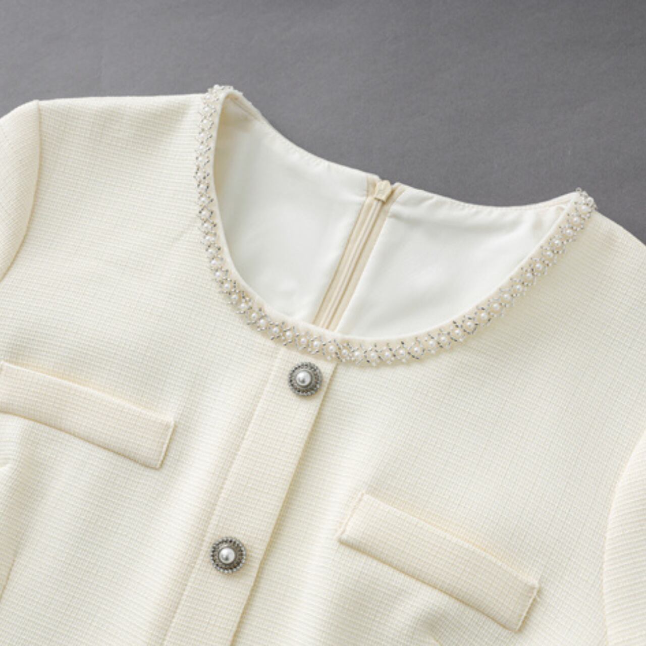 襟元の洗練されたデザインが、シンプルでありながら上品さを際立たせます。