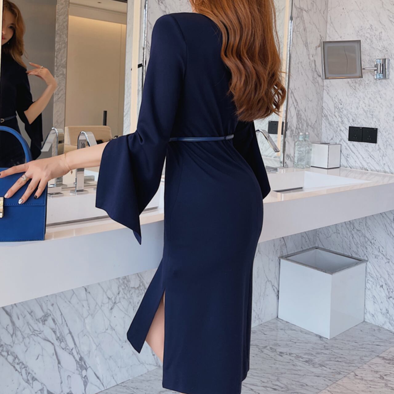 このネイビーの膝丈ドレスは、洗練されたスタイルと美しいシルエットが魅力的です。