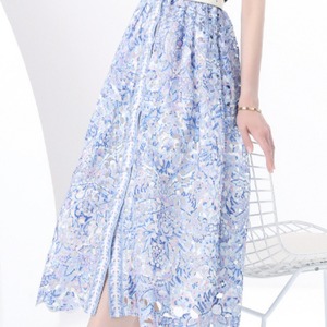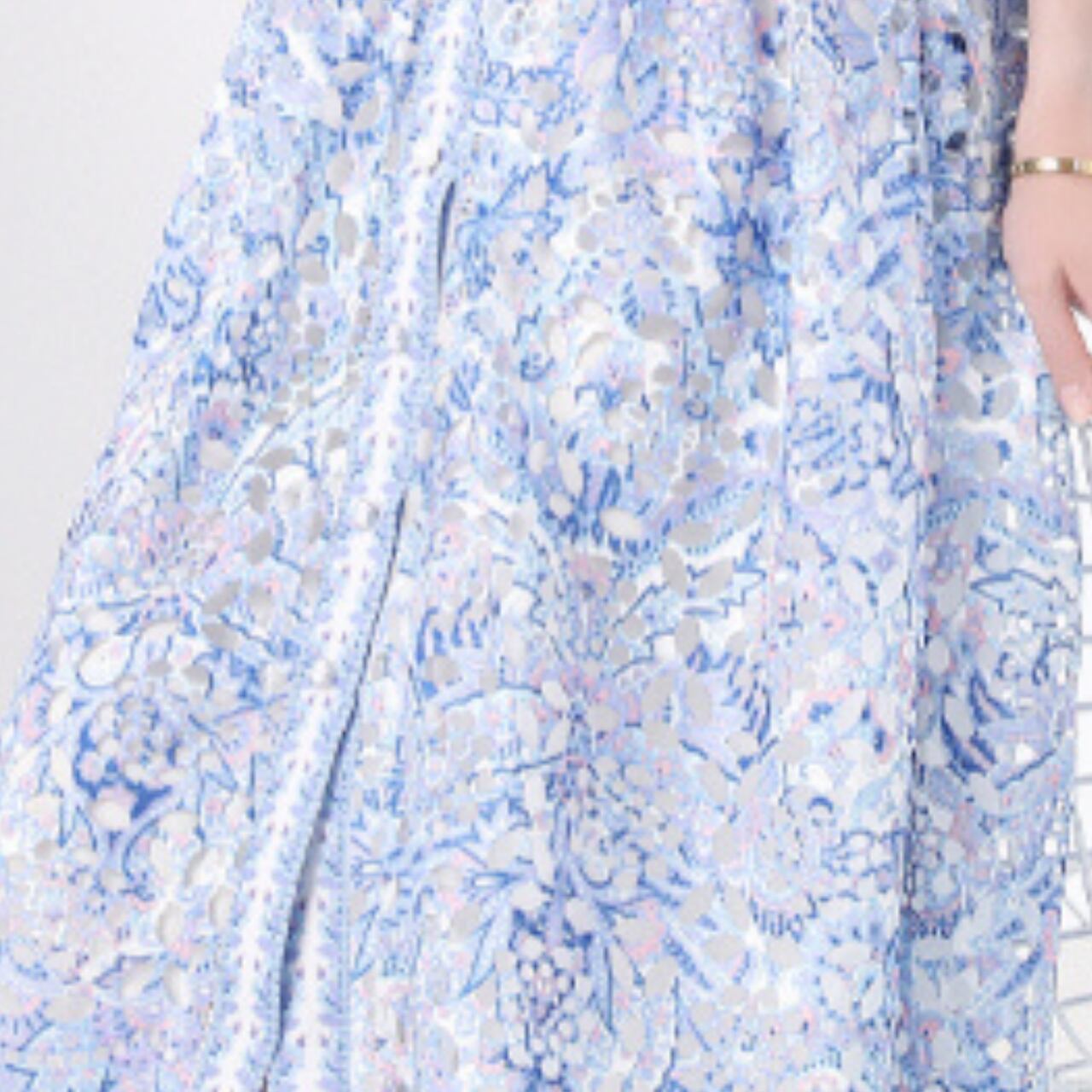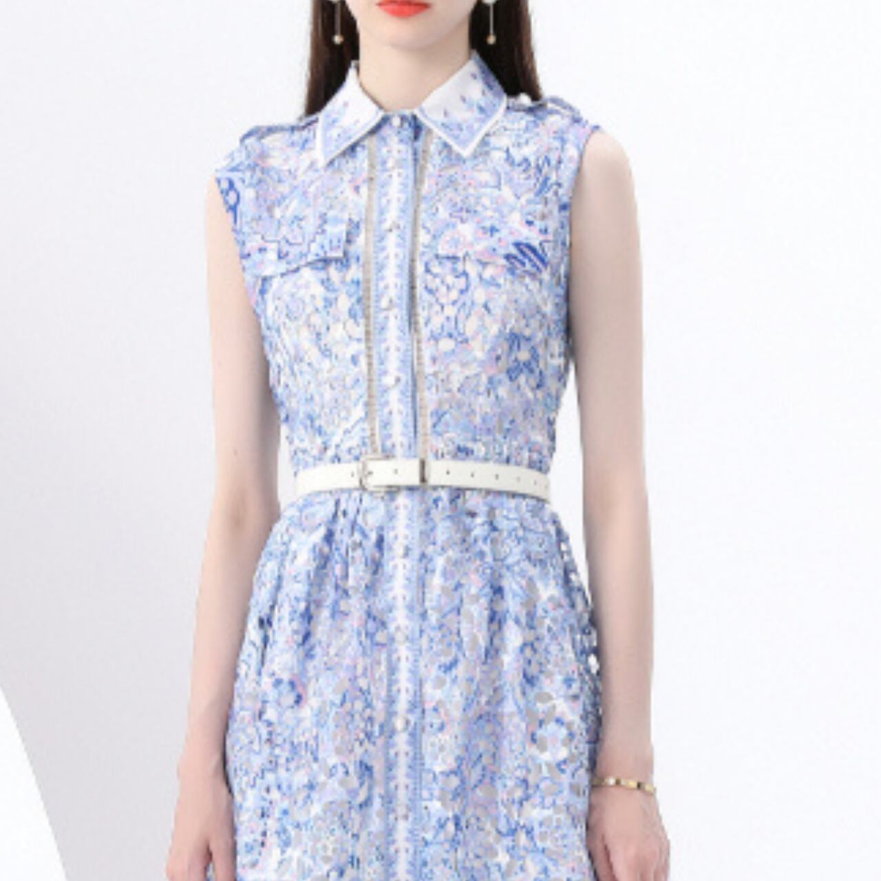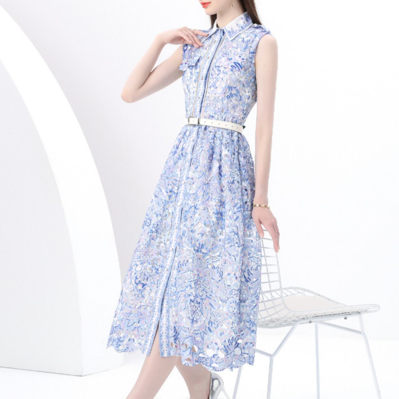 エレガントなブルーの花柄ミディ丈ドレスは、上品さと軽やかさを兼ね備えた一着です。ノースリーブと襟付きデザインが洗練された印象を演出し特別なイベントや日常のスタイリングに最適なアイテムです。