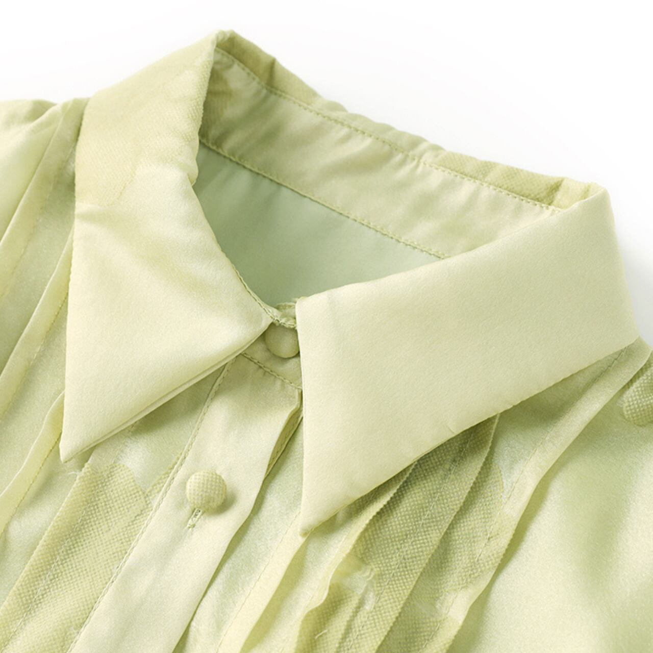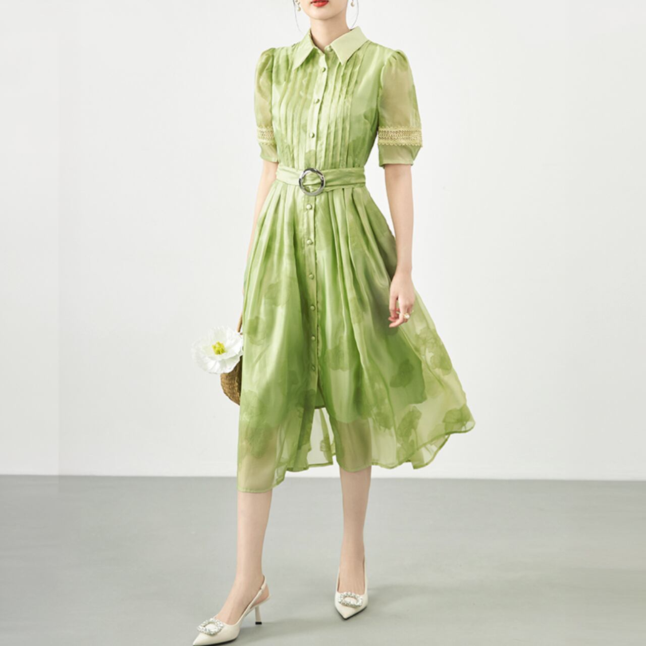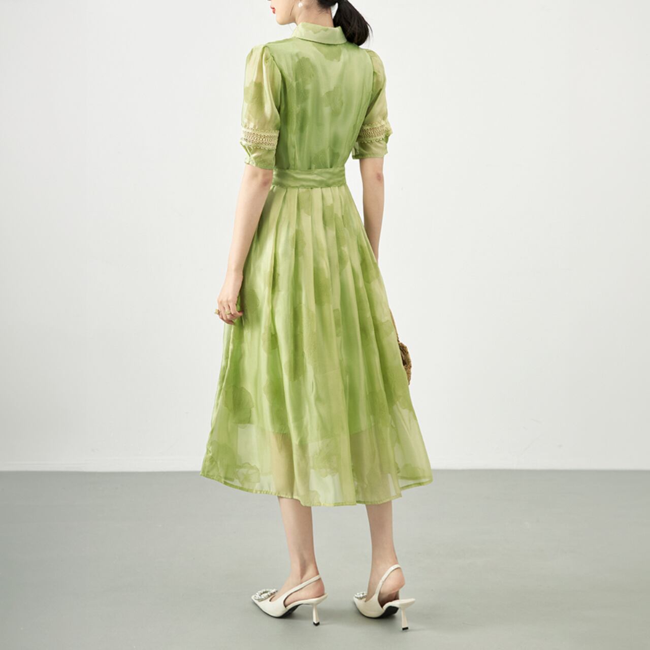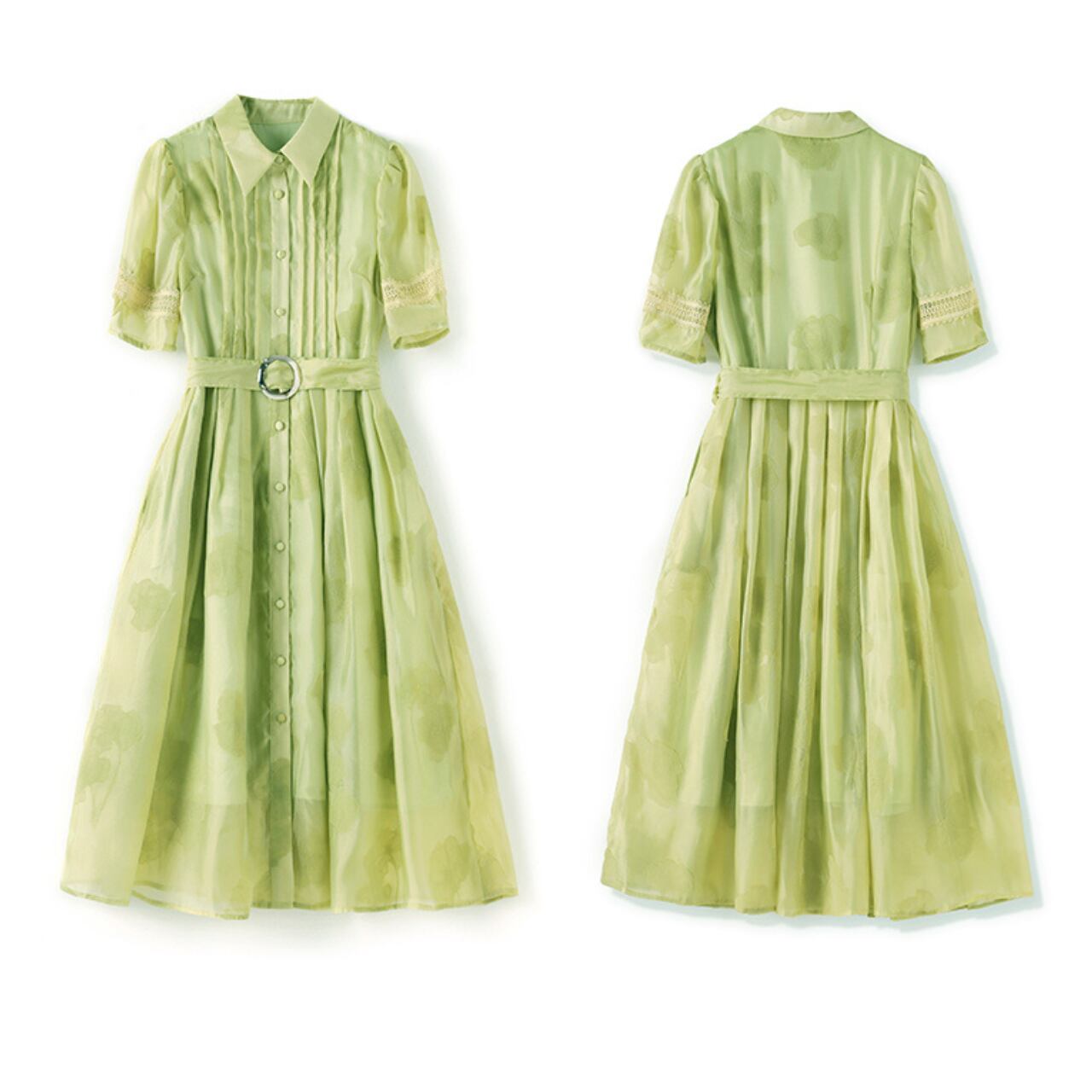 このドレスは、エレガントなグリーンカラーと繊細な花柄模様が特徴です。ウエストのバックル付きベルトが美しいシルエットを強調し、スタンドカラーが上品さを引き立てます。特別なイベントやパーティーにぴったりの一着で、華やかさと自信をプラスします。