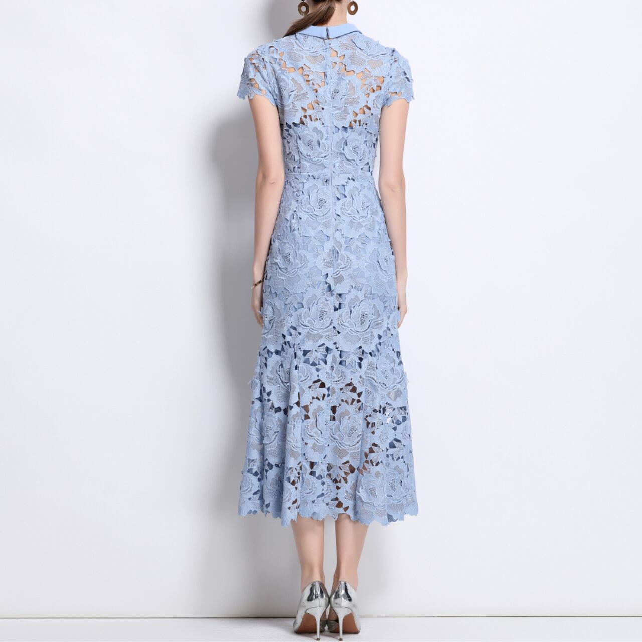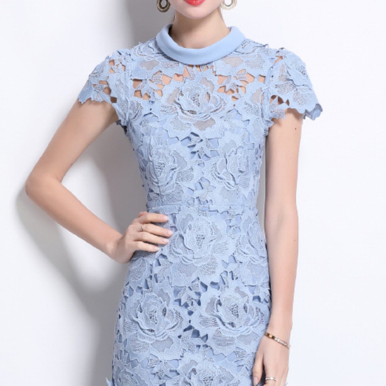 優雅に咲き誇るフラワーレースが全面にあしらわれた、ライトブルーのミモレ丈ドレス。