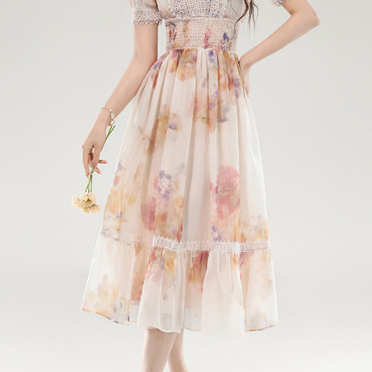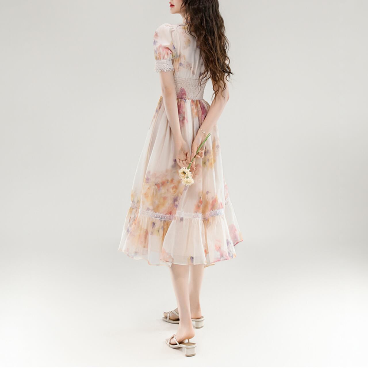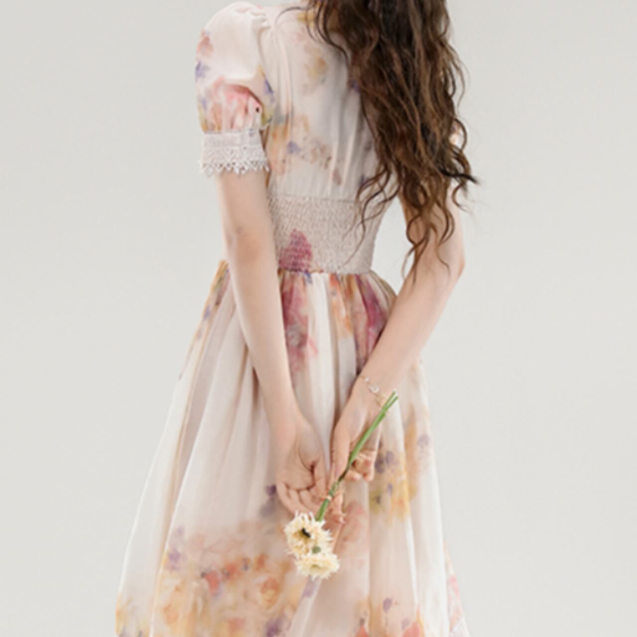 ふんわりと広がるシフォン素材に繊細なフラワープリントを重ねた、春夏にぴったりのドレス。