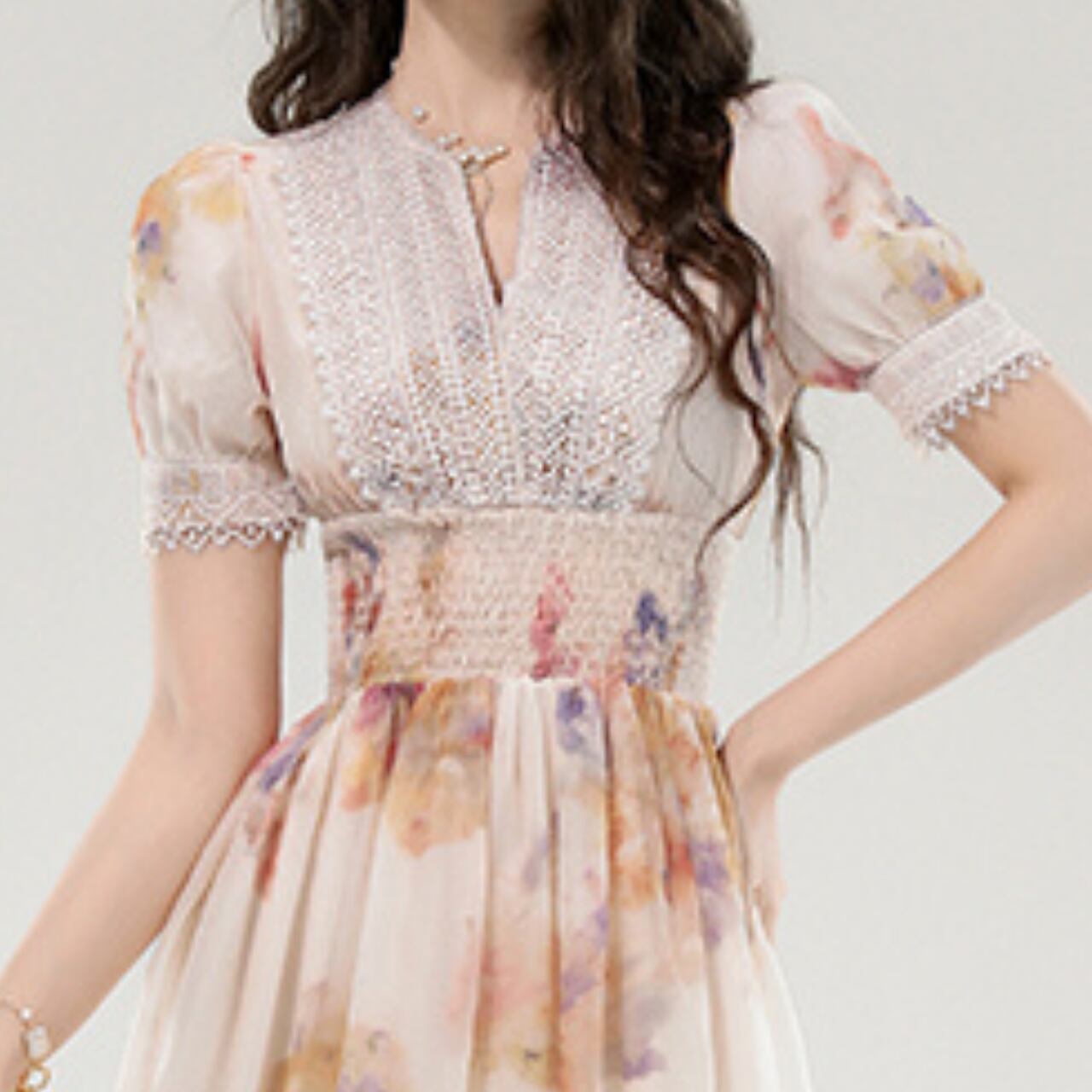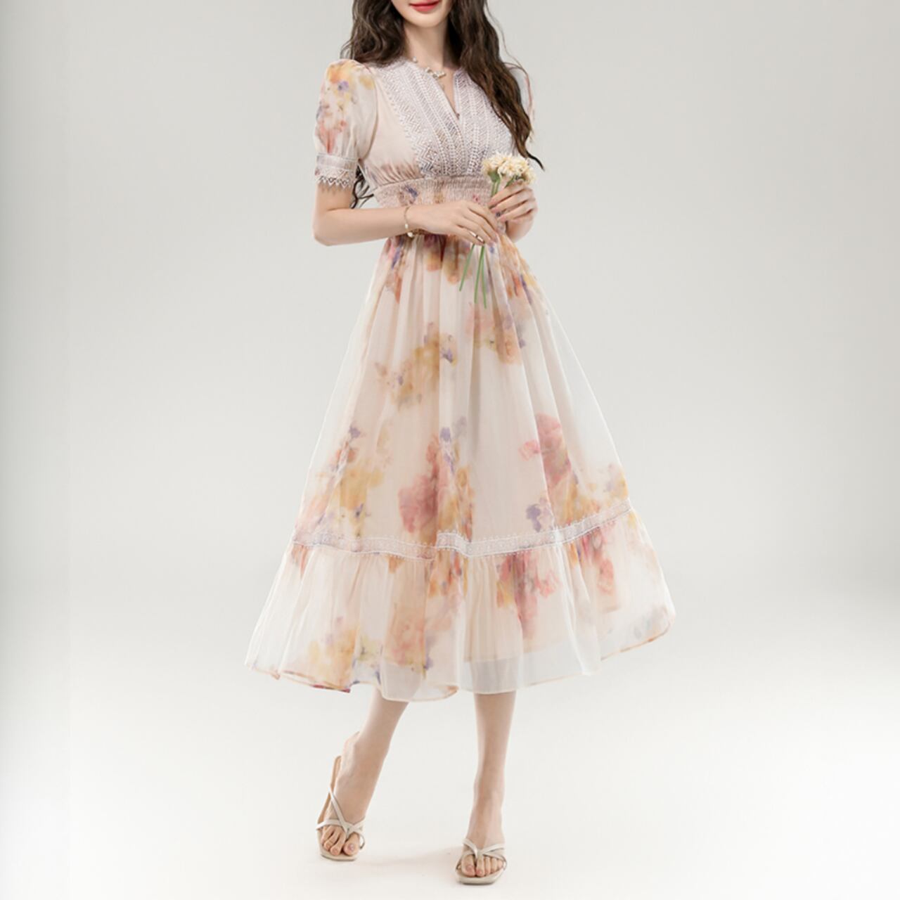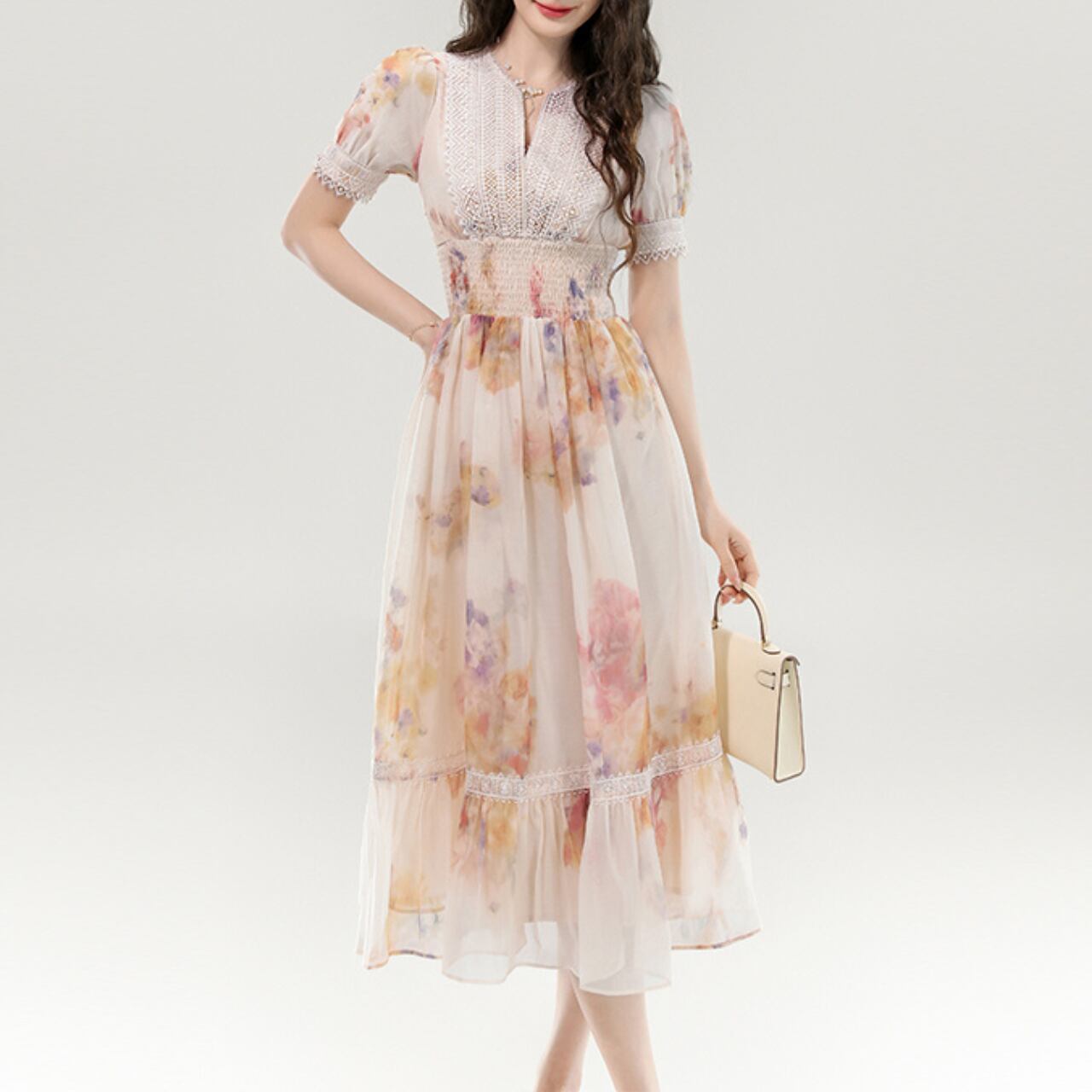 ふんわりと広がるシフォン素材に繊細なフラワープリントを重ねた、春夏にぴったりのドレス。