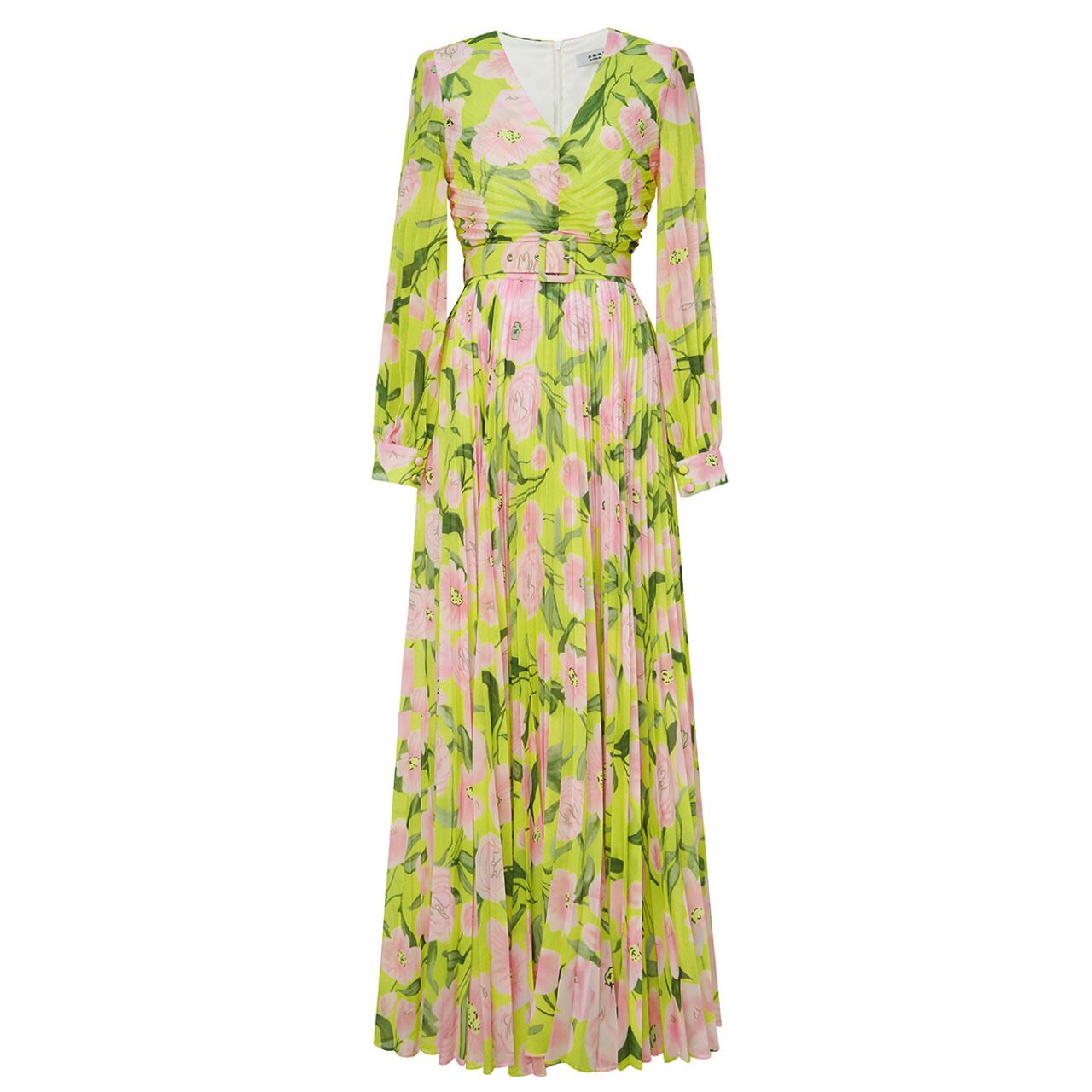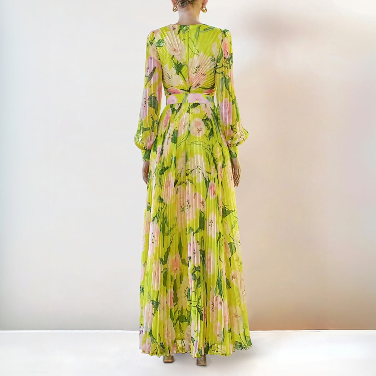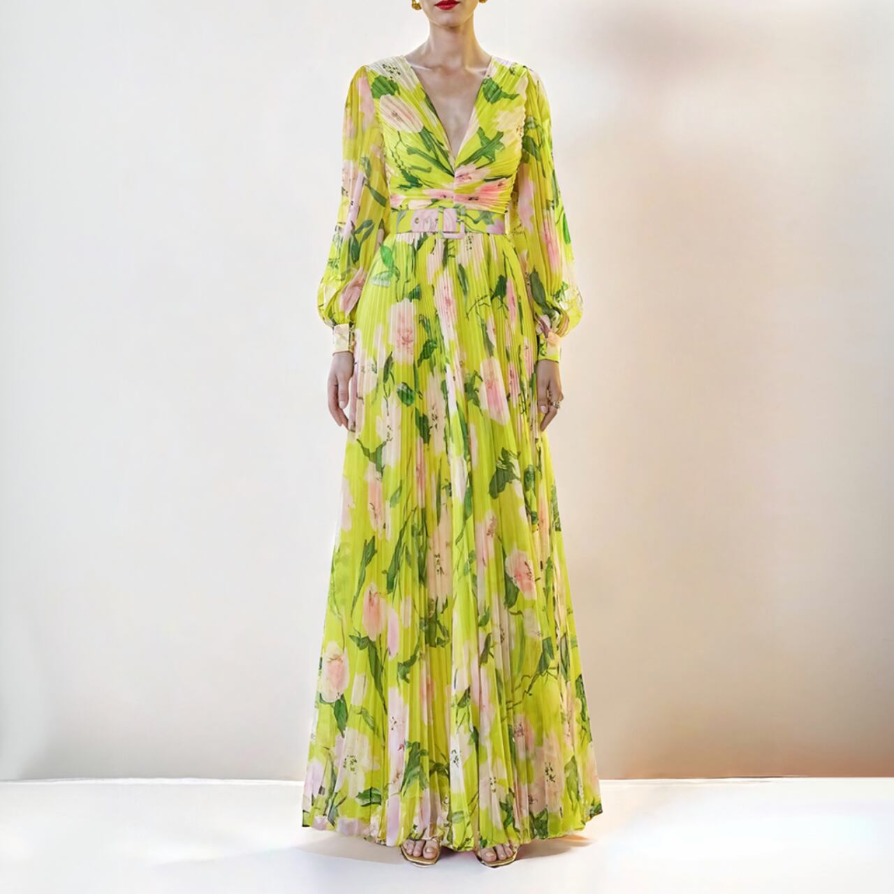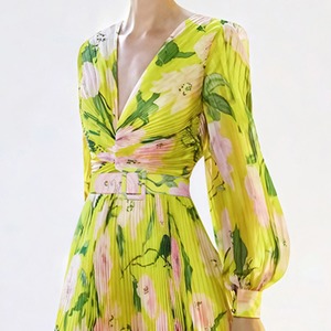 春夏の特別なひとときにぴったりな、鮮やかな黄色の花柄ロングドレス。 深いVネックで女性らしいシルエットを演出 。どんなシーンでも視線を引きつけるこのドレスで、ワンランク上のスタイルを楽しんでみませんか。