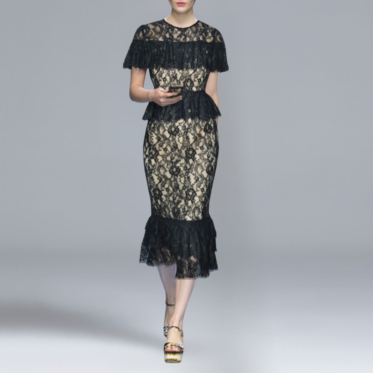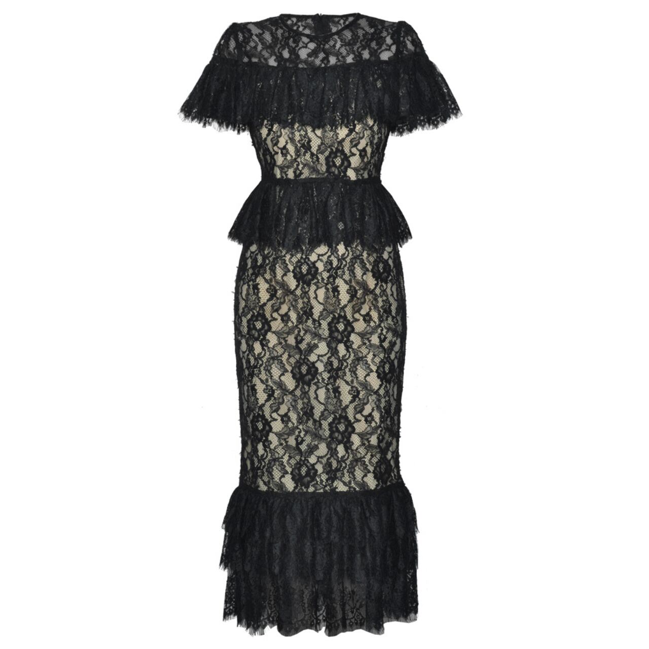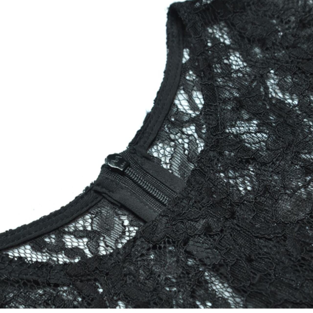 クラシカルなブラックレースに包まれたタイトなシルエットが、大人の色香を引き立てる一着。