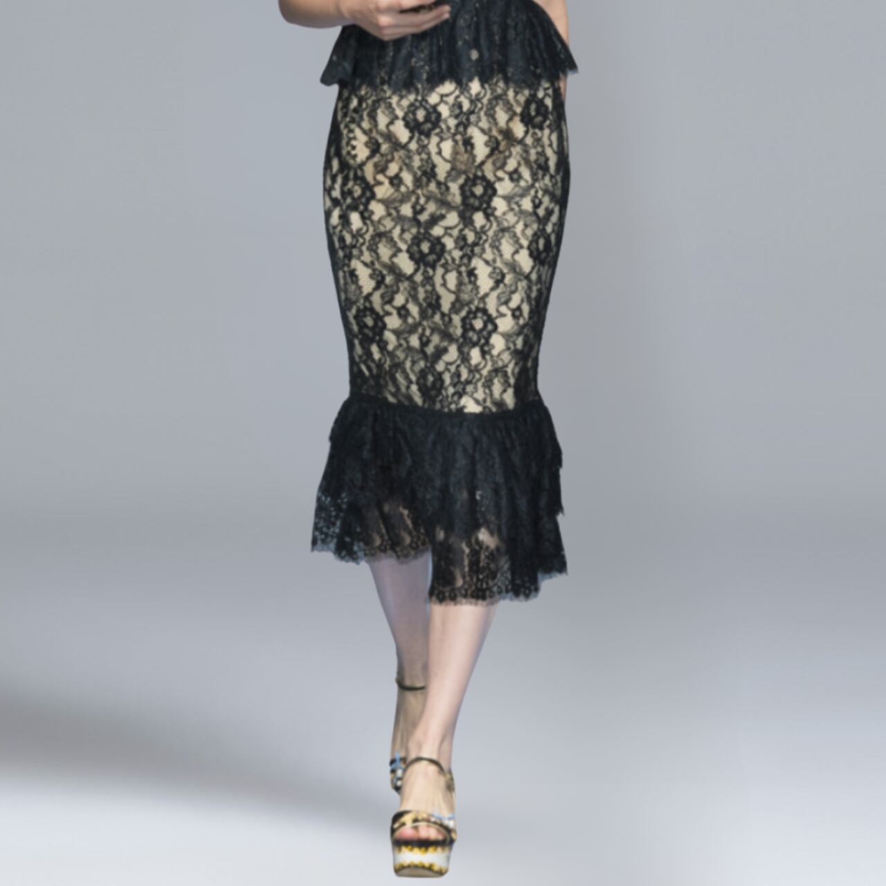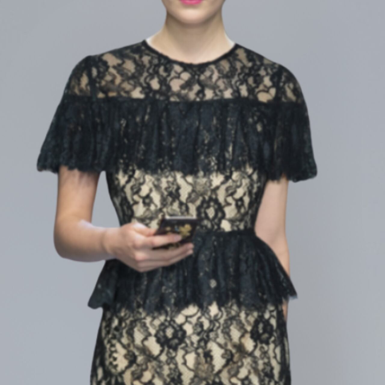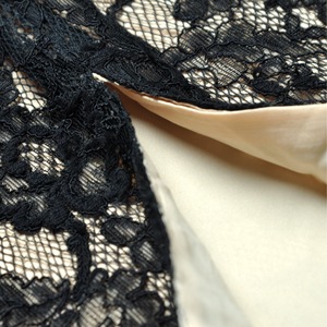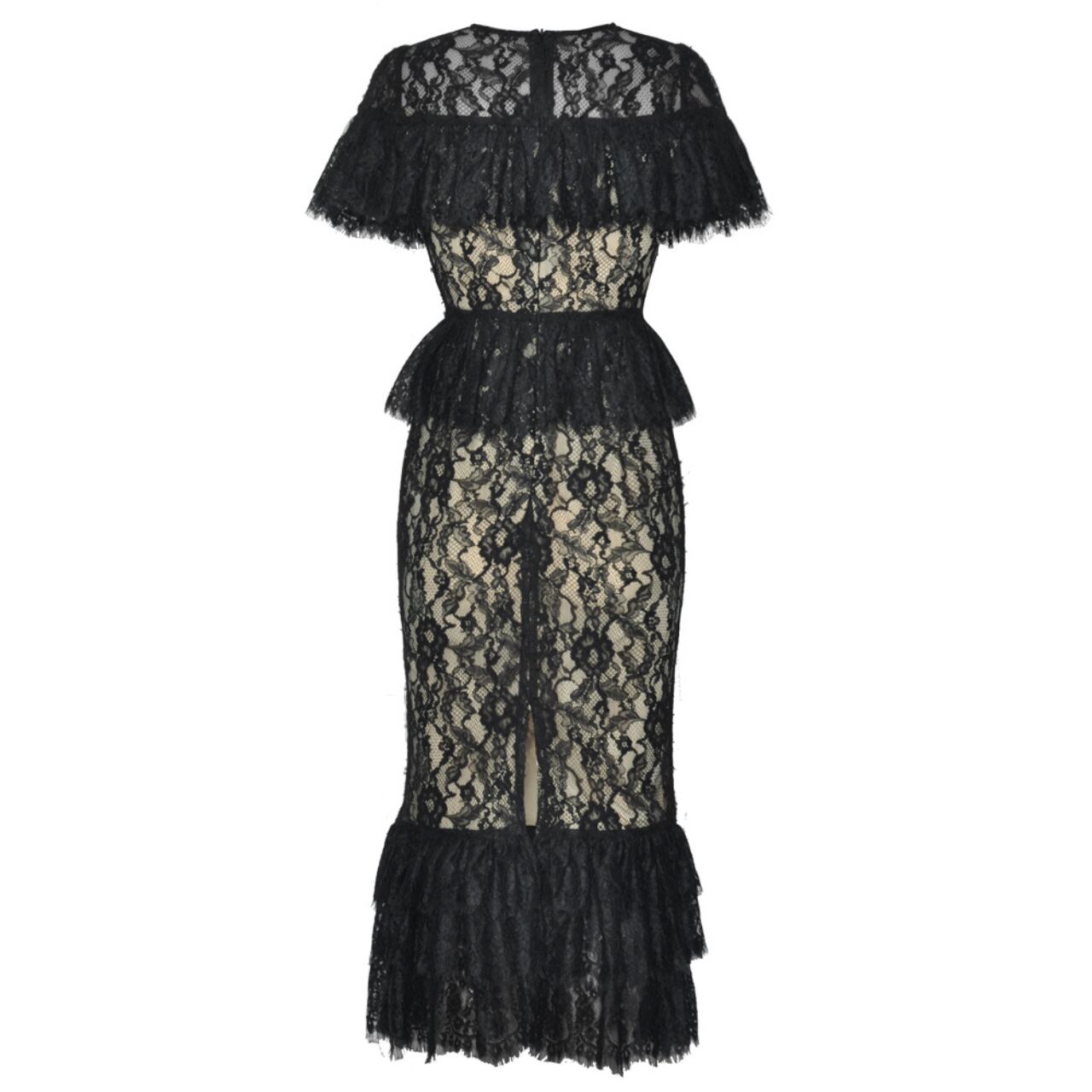 クラシカルなブラックレースに包まれたタイトなシルエットが、大人の色香を引き立てる一着。