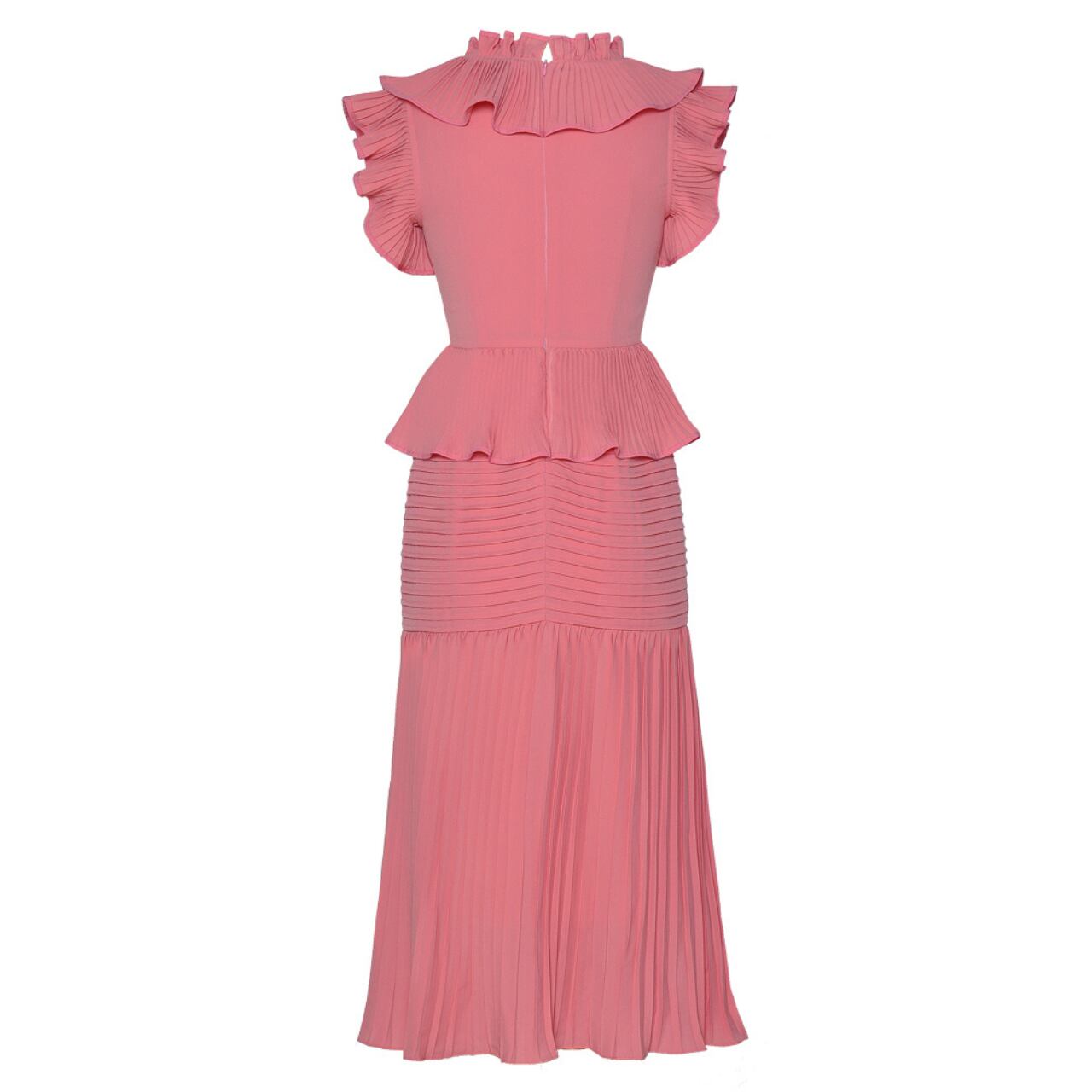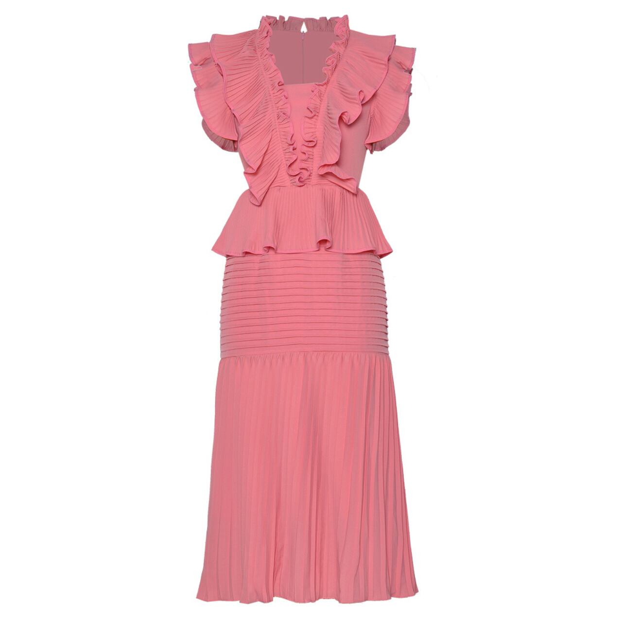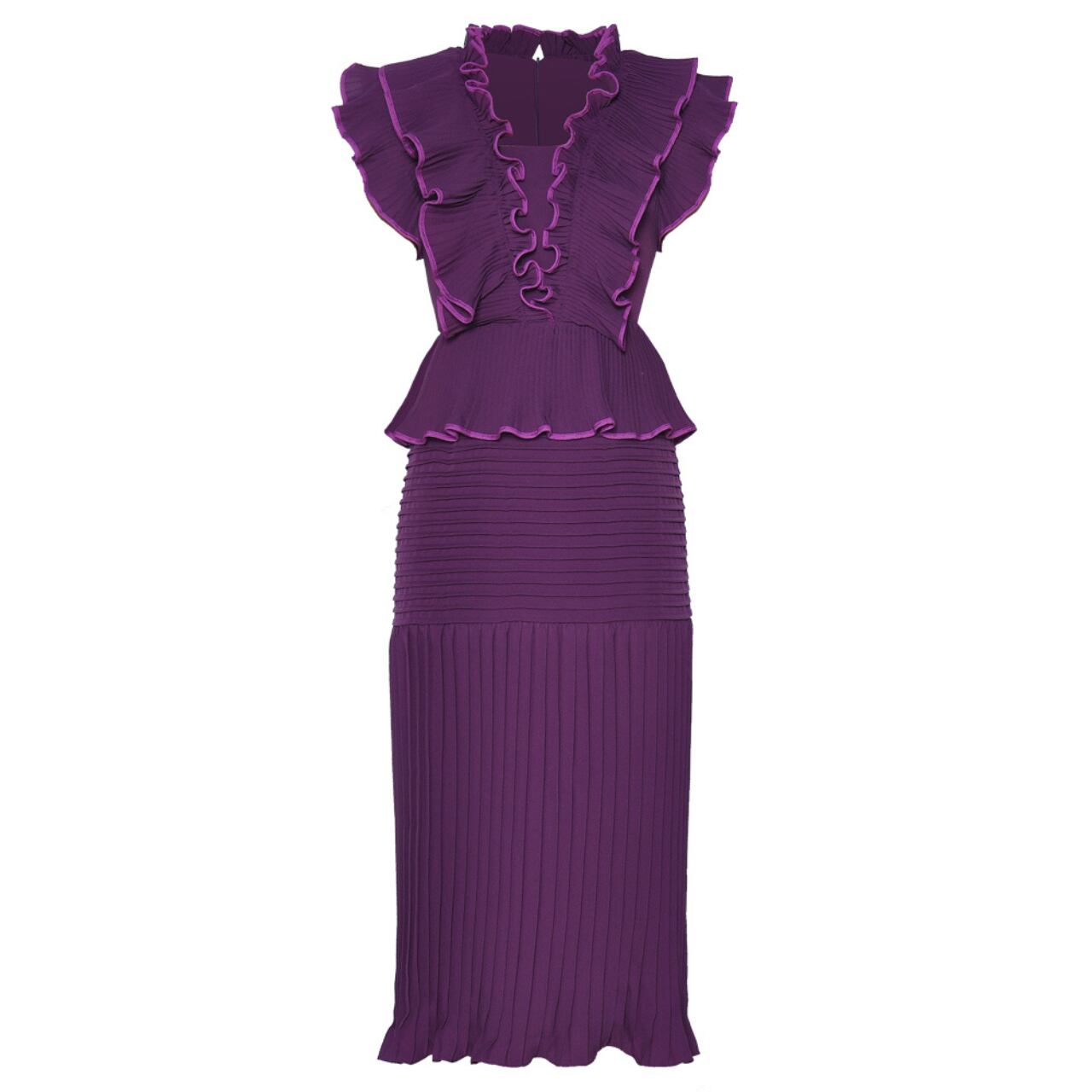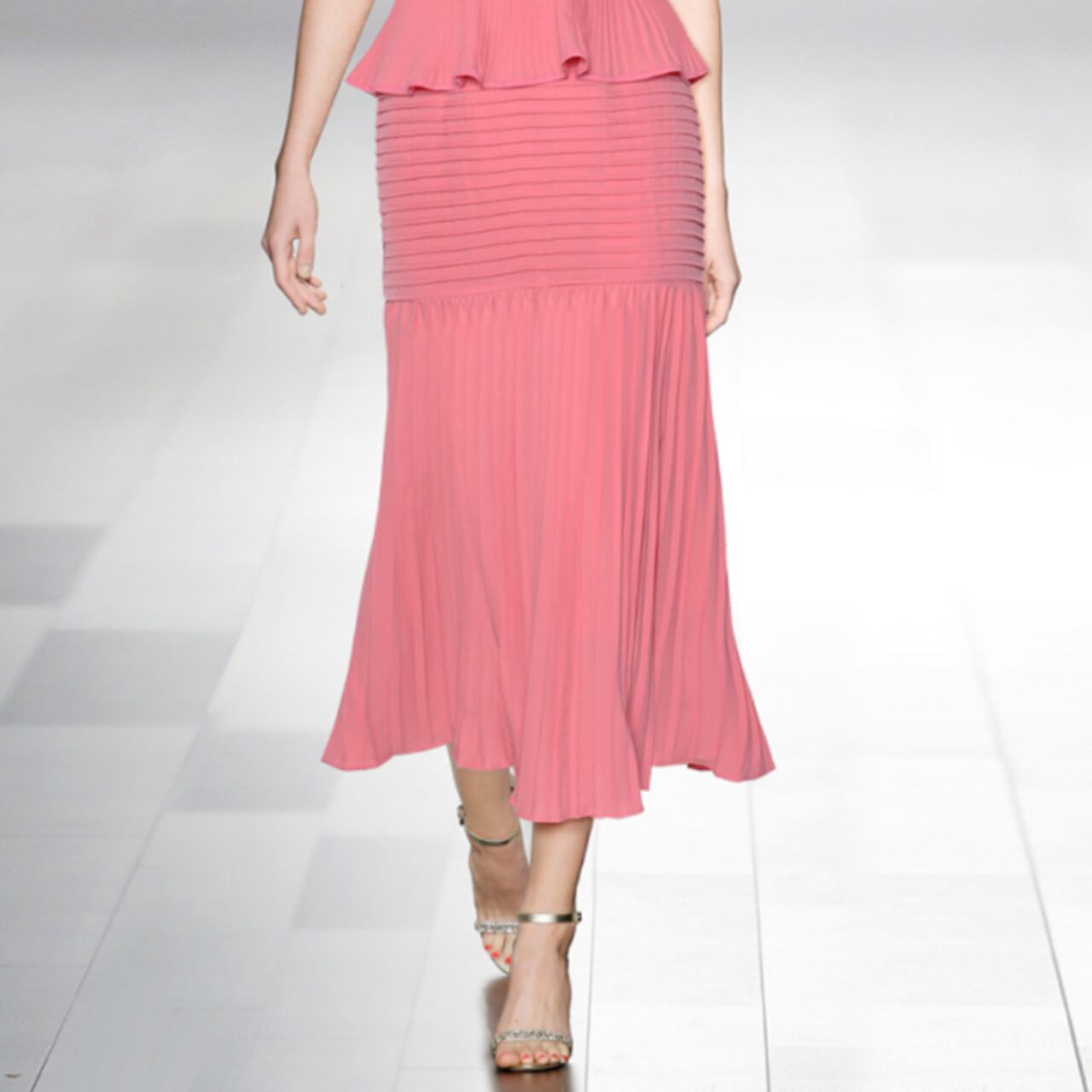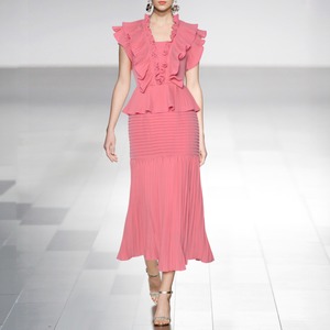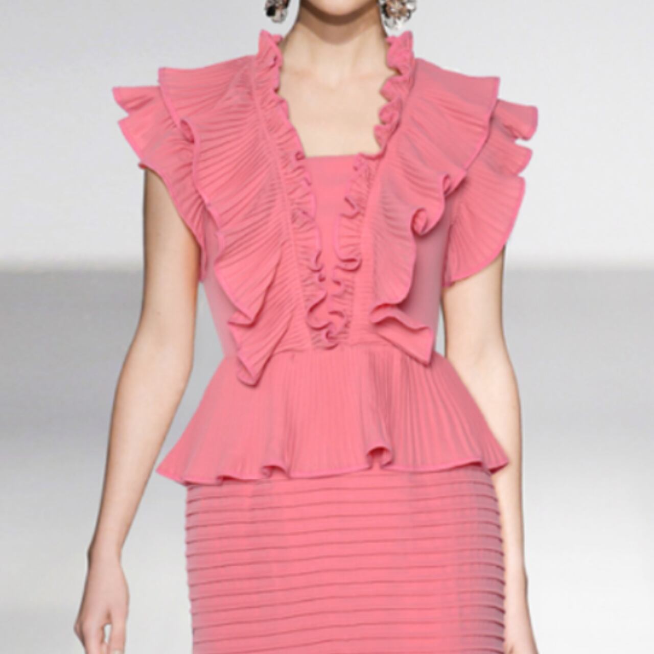 華やかなフリルのディテールが施されたトップスと、ウエストを引き締めるプリーツがスタイルを美しく演出します。