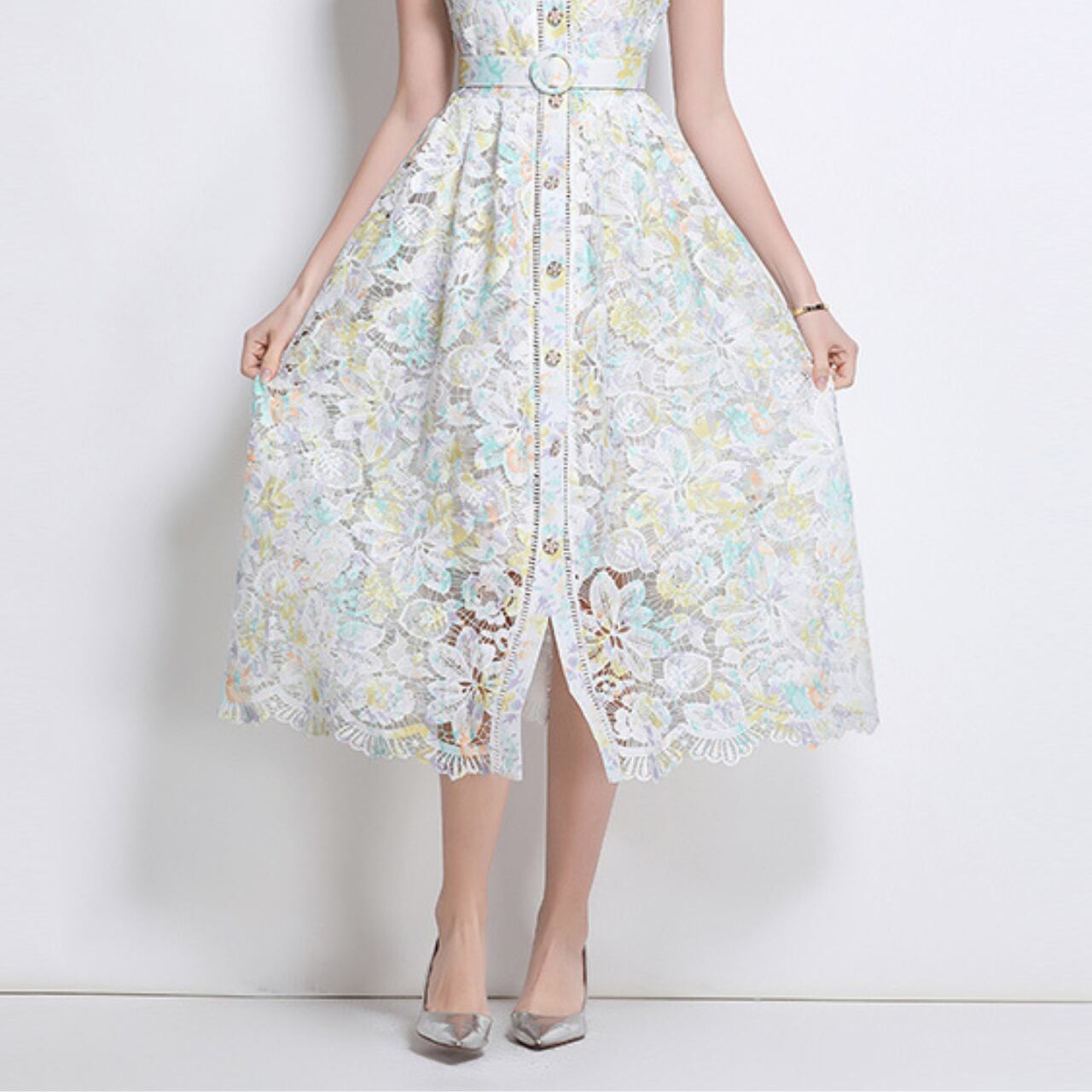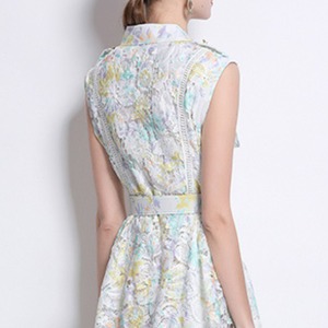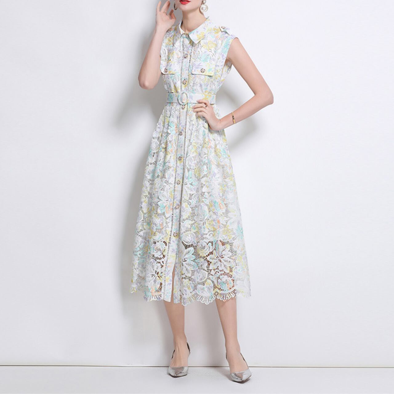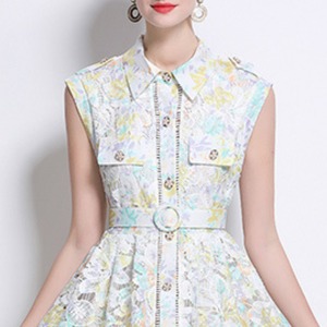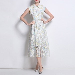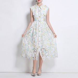 繊細なレースとクラシカルな襟元が調和する、気品あふれるクラシカルノースリーブドレス。ボタンで縦のラインが強調され、ウエストベルトがスタイルにメリハリを与えます。ノースリーブの軽やかさと膝下丈の上品さが、日常にも特別な瞬間にも優しく寄り添うデザイン。