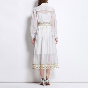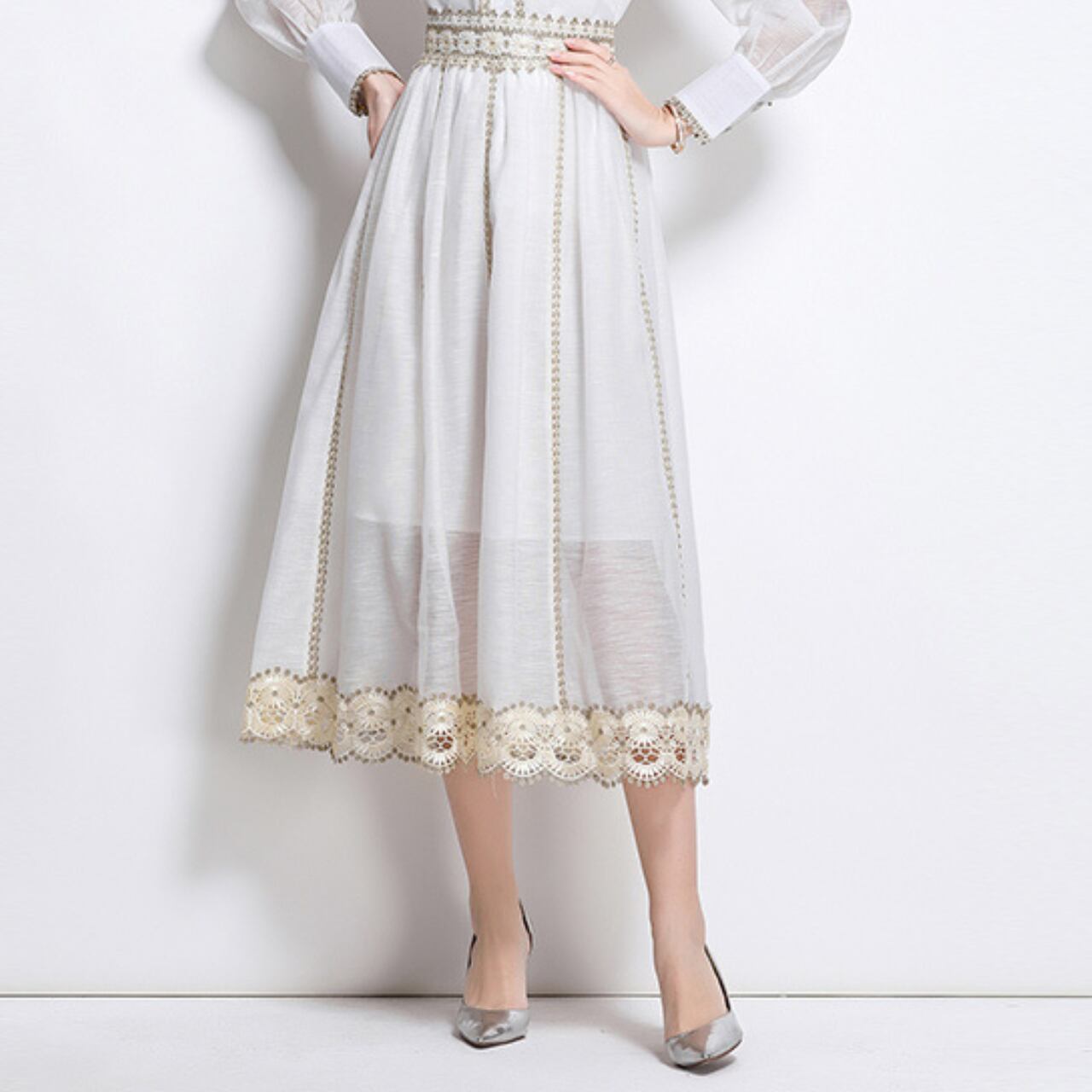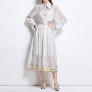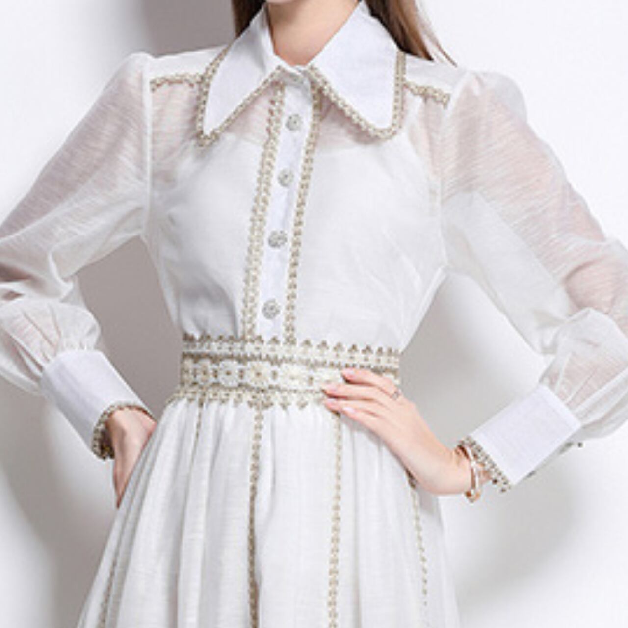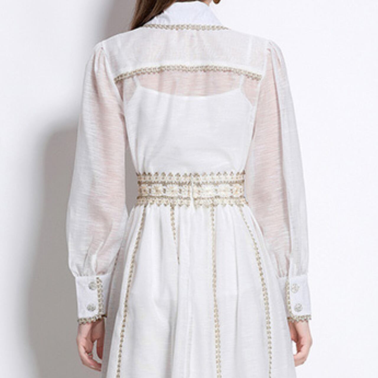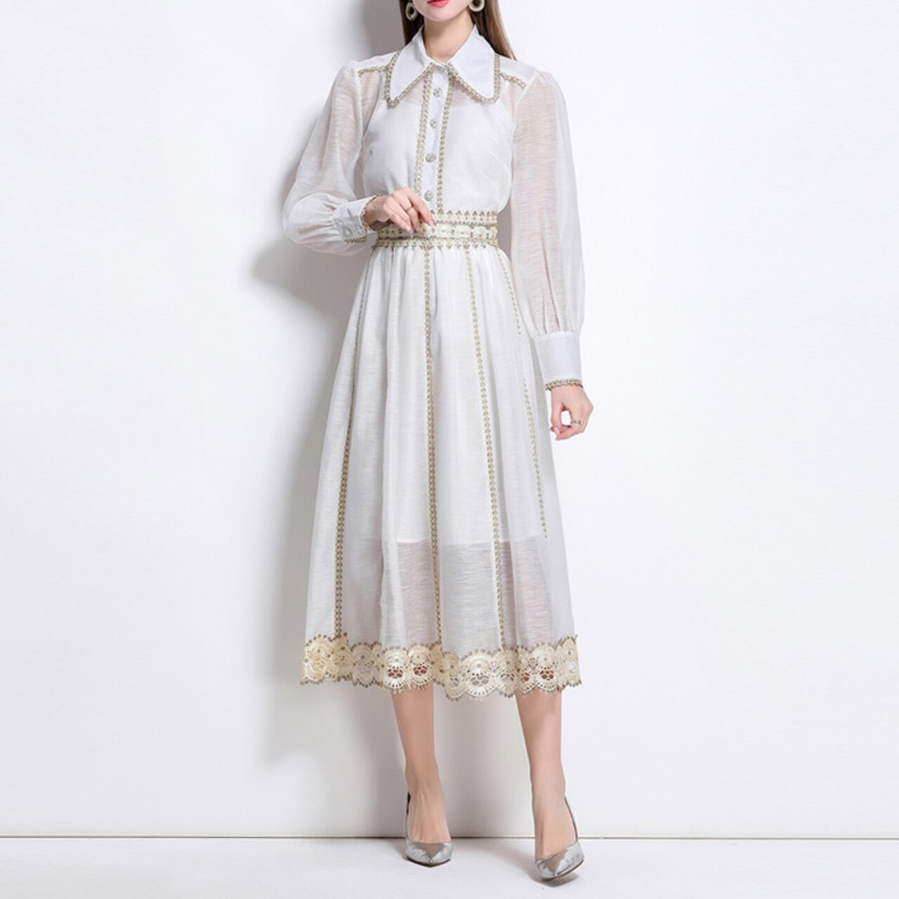 丁寧に施された優雅な旋律のように流れるホワイトワンピース。クラシカルな襟元とシアーな袖が、気品ある余韻を残しつつ、現代的なエレガンスを添えます。上質なクラシックを生きる一着です。