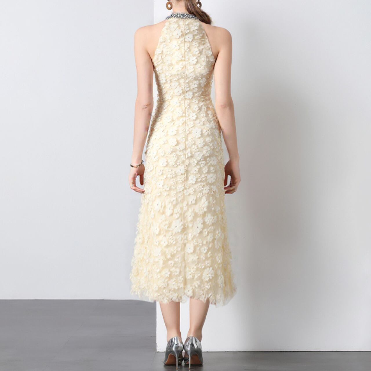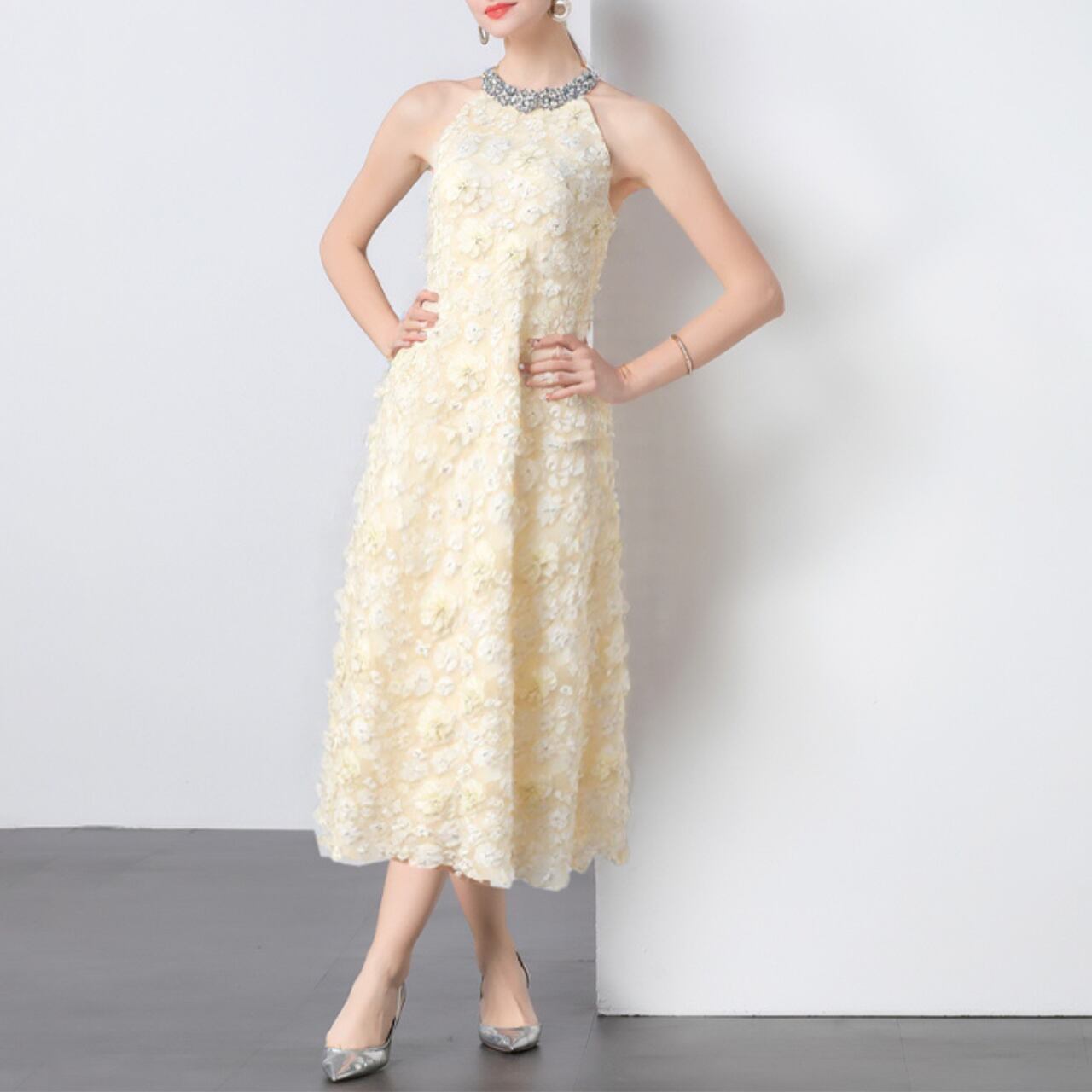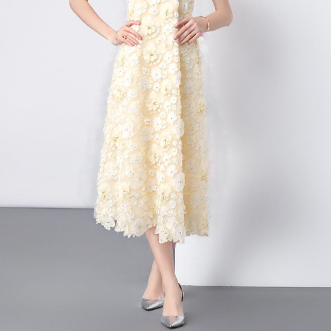 見ているだけで心がほどけるような、柔らかな輝き。足元に流れるミディアム丈のシルエットが、日常を優雅にアップデート。フォーマルにもナチュラルにも馴染むその佇まいは、「特別すぎない特別」を叶えてくれる一着。