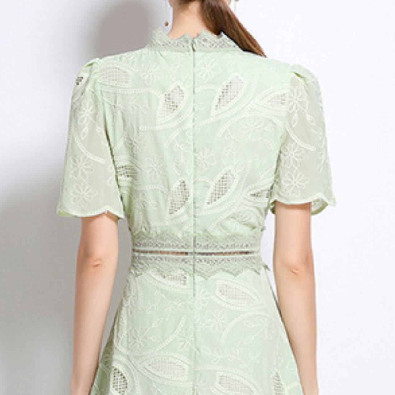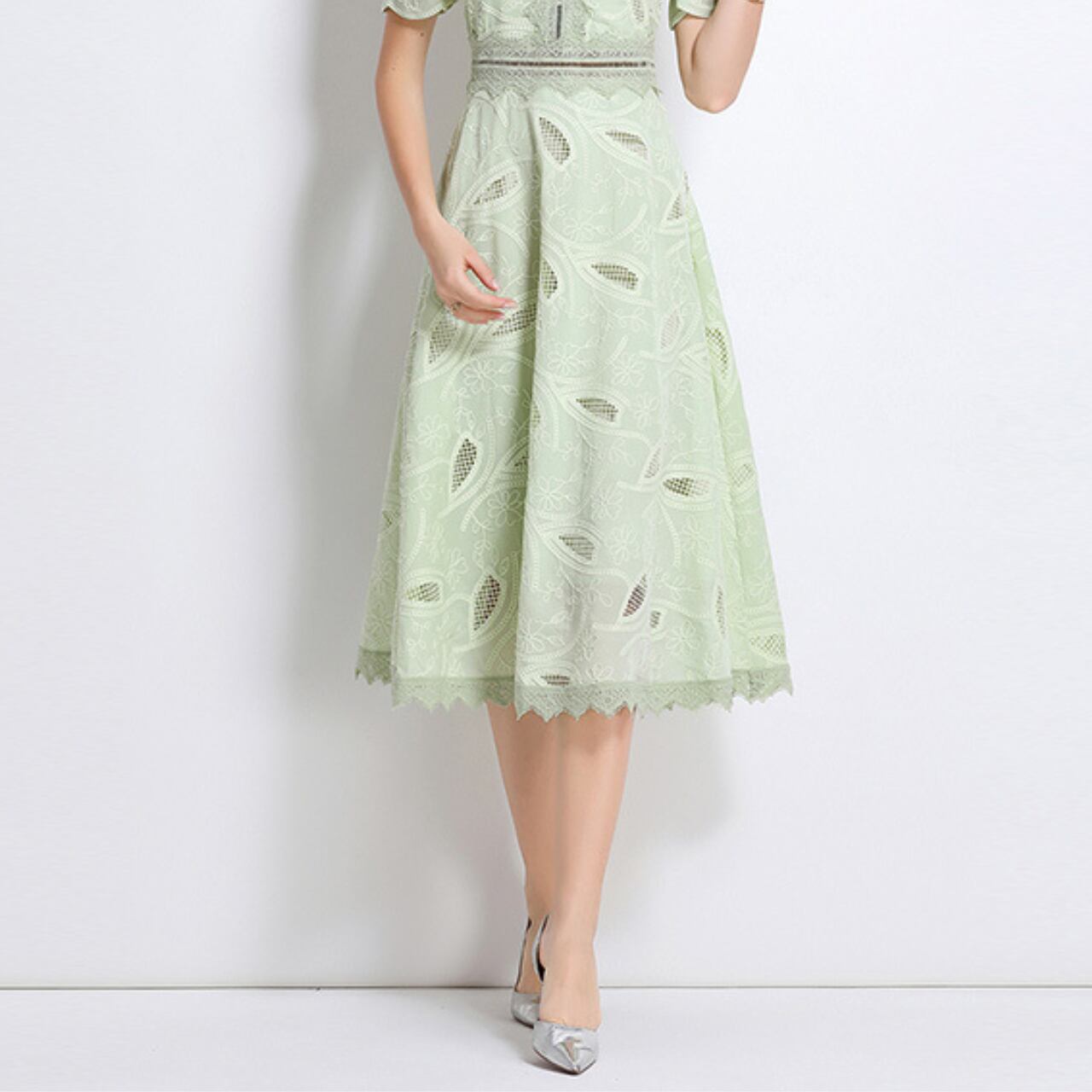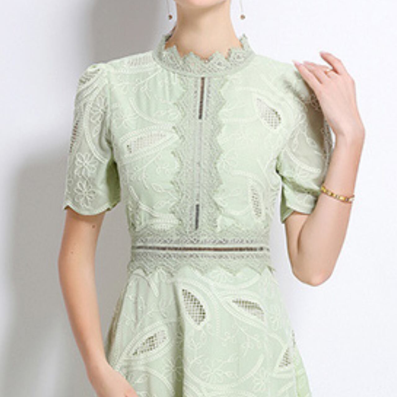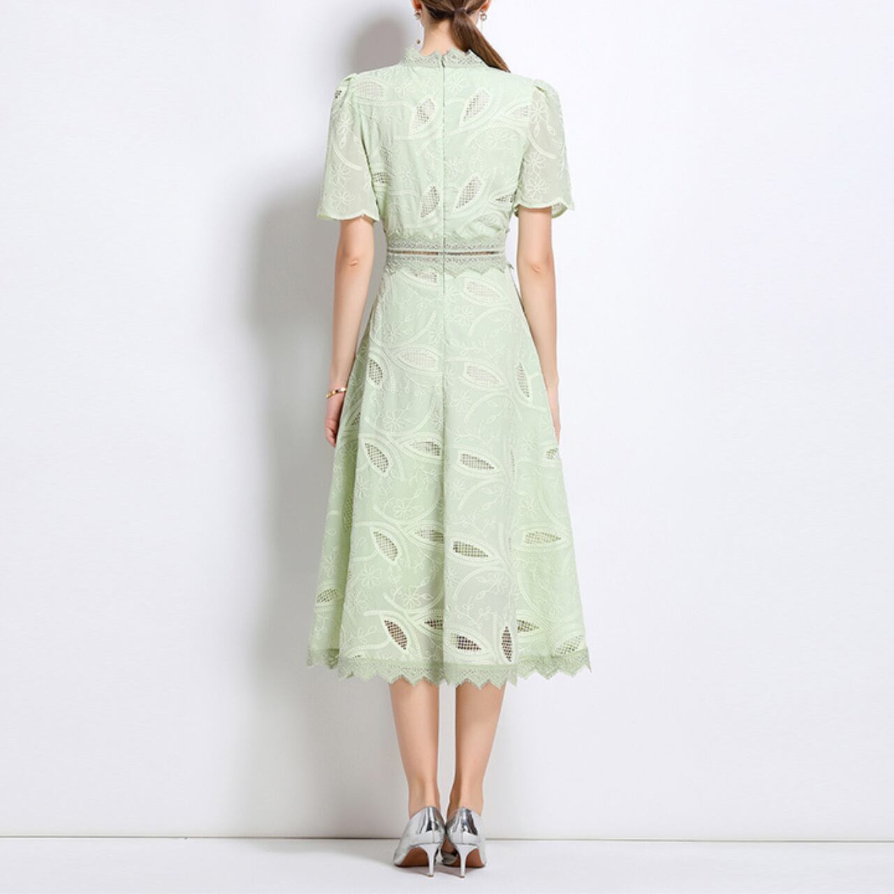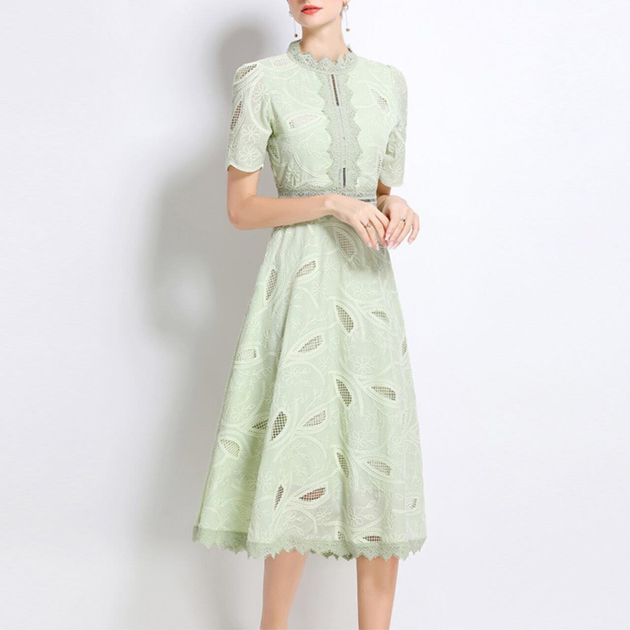 爽やかな色調に、葉のモチーフを織り込んだレースが優雅な陰影を描くドレス。高めの襟元とフレアなスカートが、クラシカルな気品と軽やかさを絶妙にバランス。フォーマルにも日常にも寄り添う万能さを兼ね備えたデザイン。