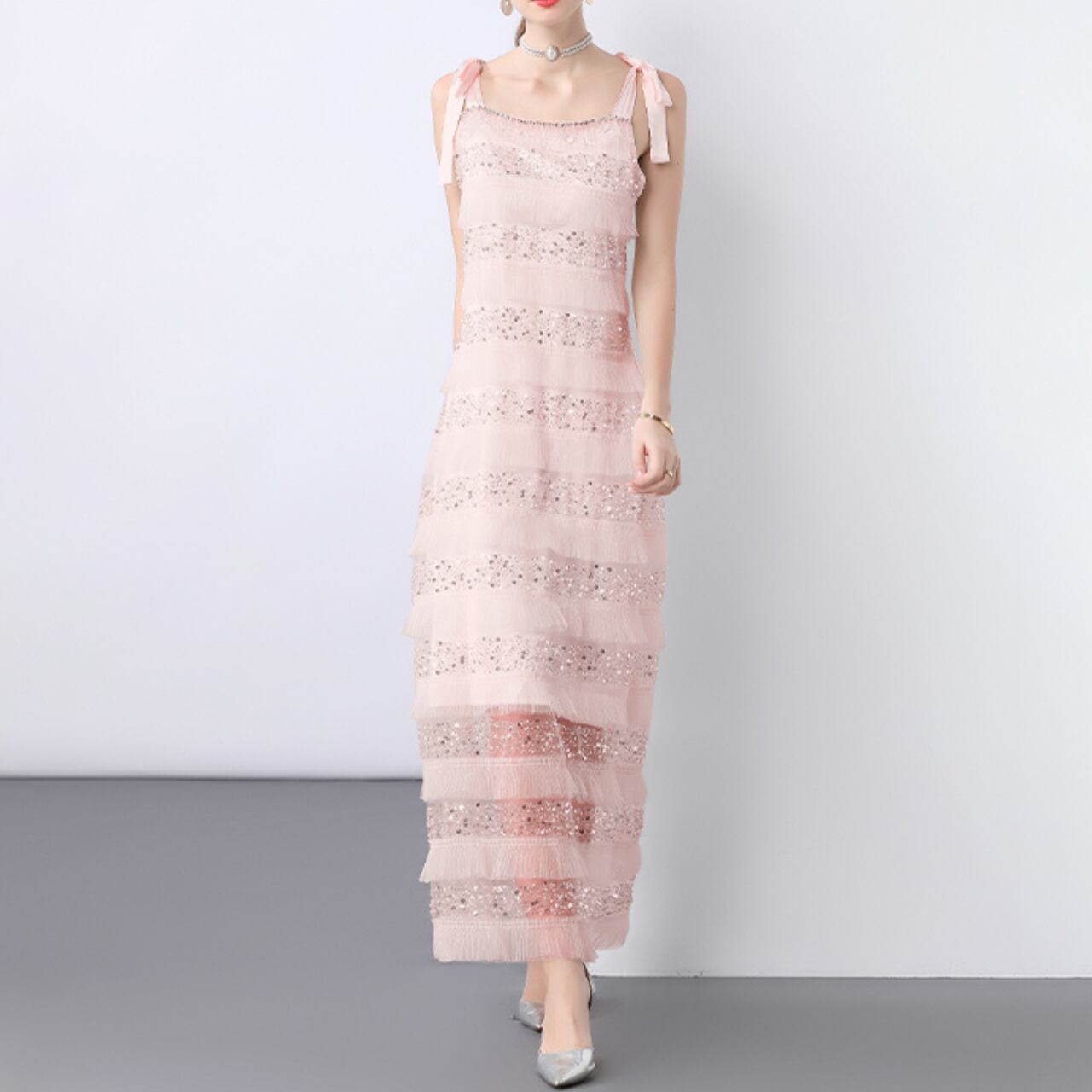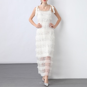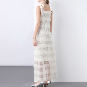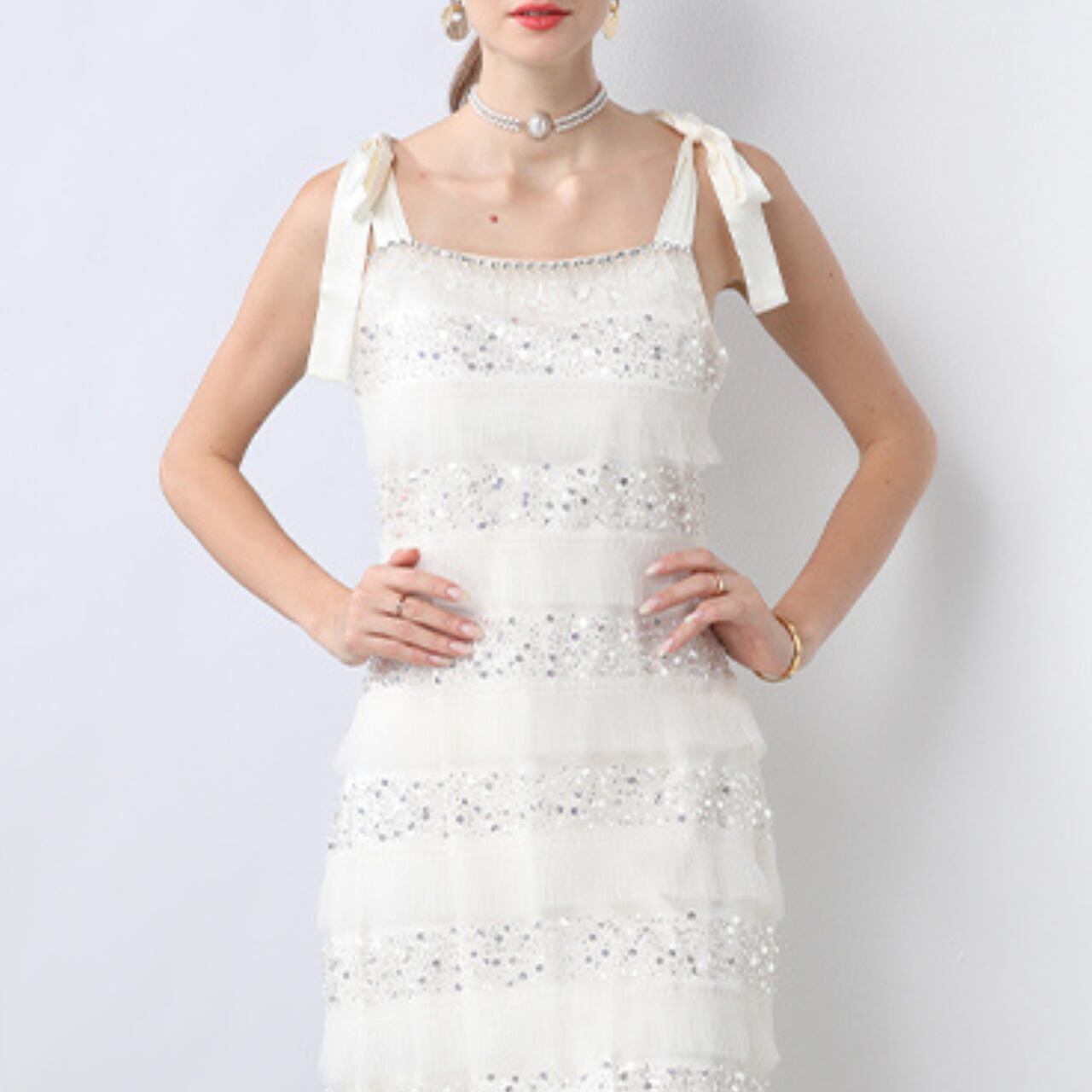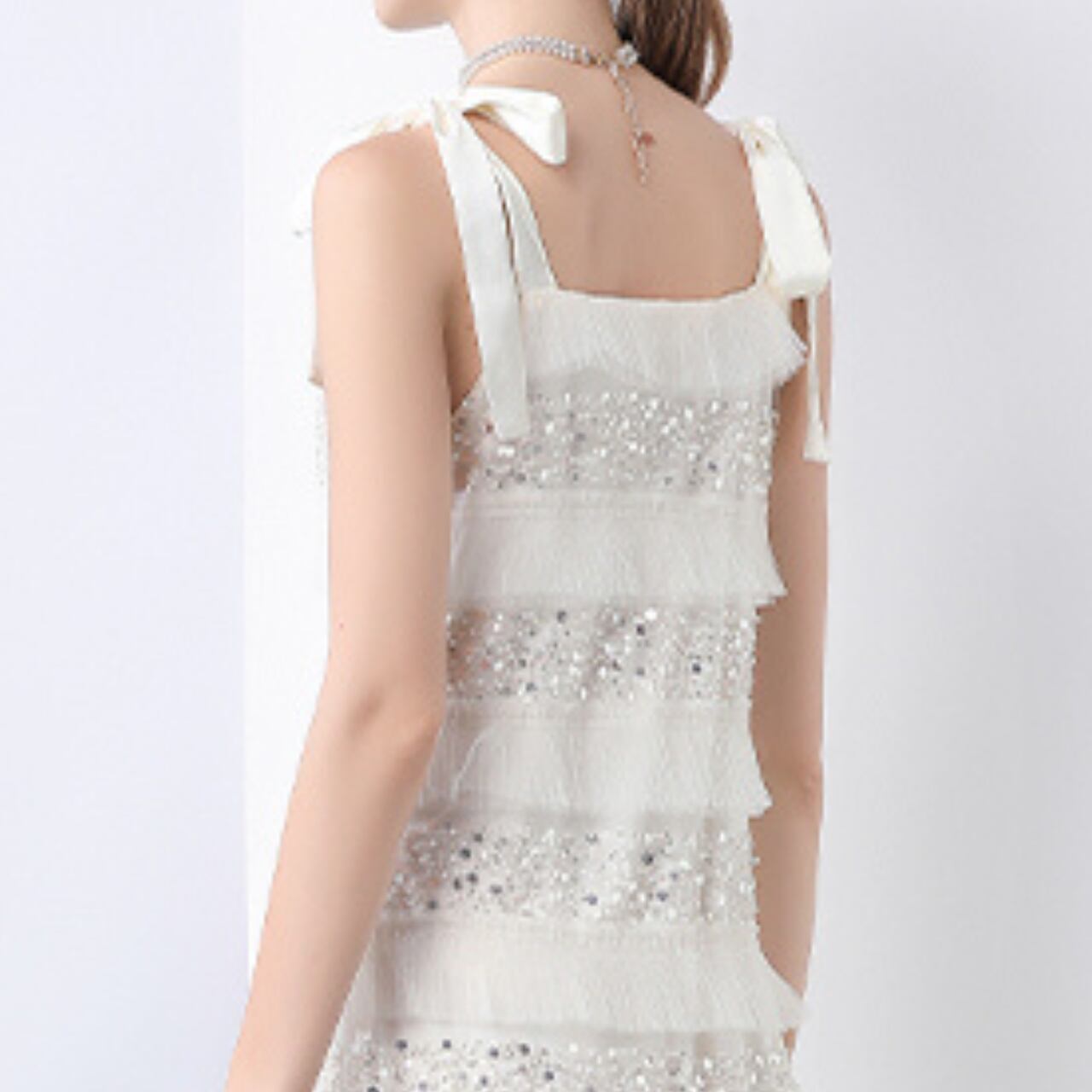 ふわりとほどける肩のリボンが、やさしいニュアンスを添えるノースリーブワンピース。横に流れるレースの陰影が、静謐さと華やかさを絶妙なバランスで引き立てます。清らかさの中に、遊び心と凛とした佇まいを秘めた一着です。