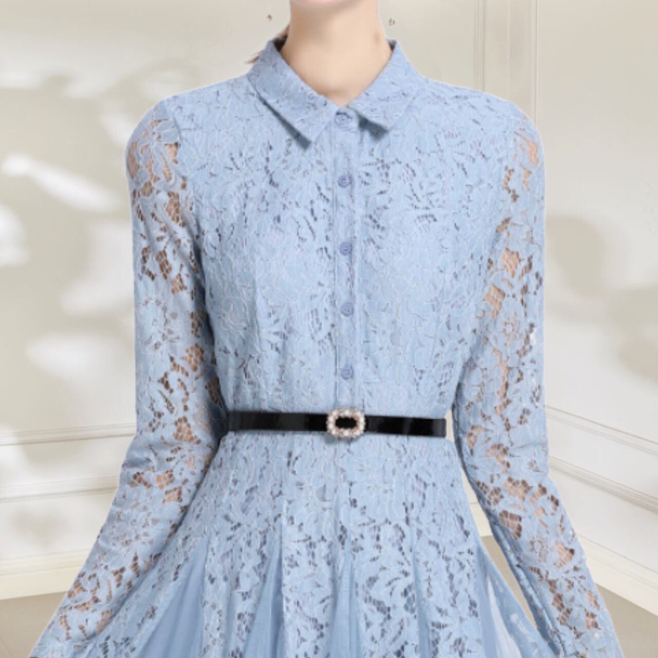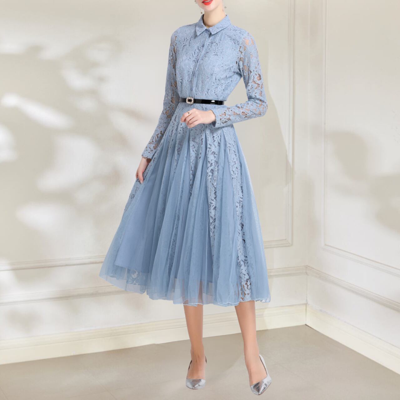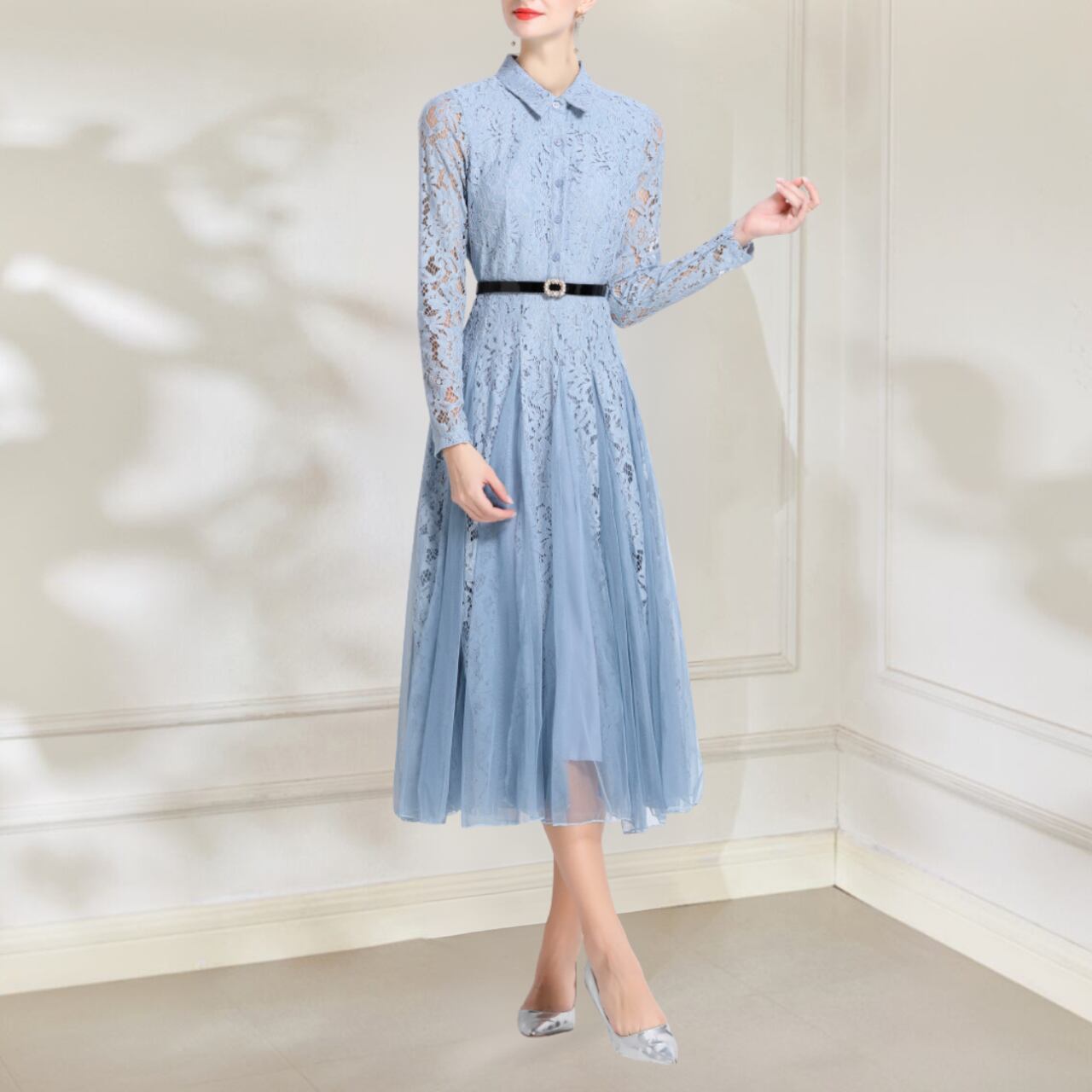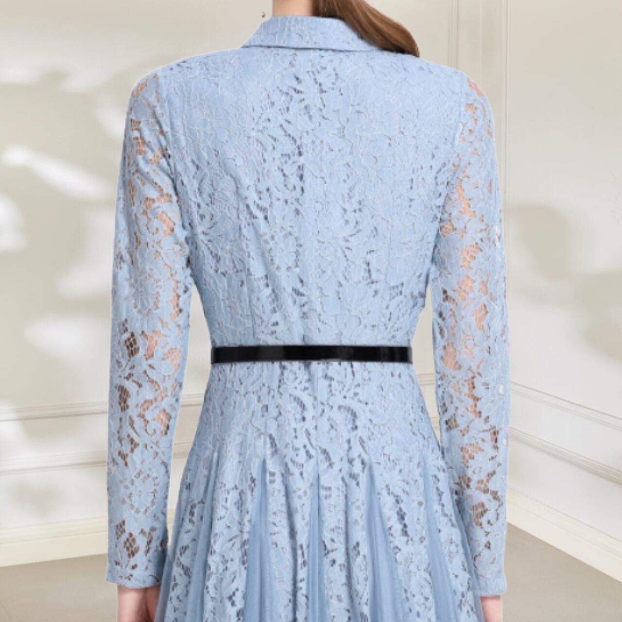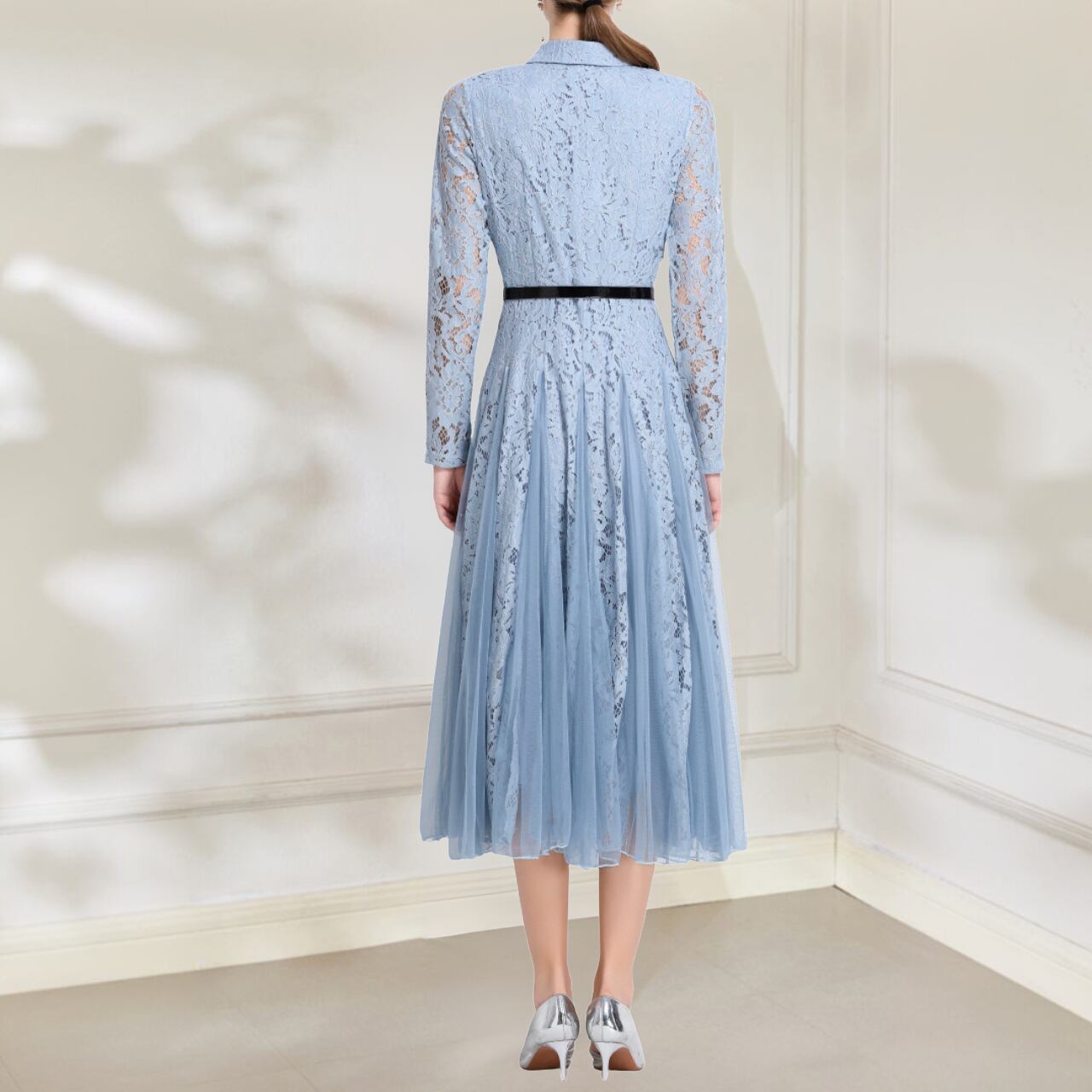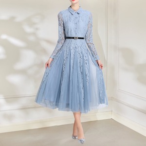 この華やかなライトブルーのドレスは、洗練された優雅さをまとったデザインです。淡いフラワープリントが繊細で動きを美しく引き立てます。