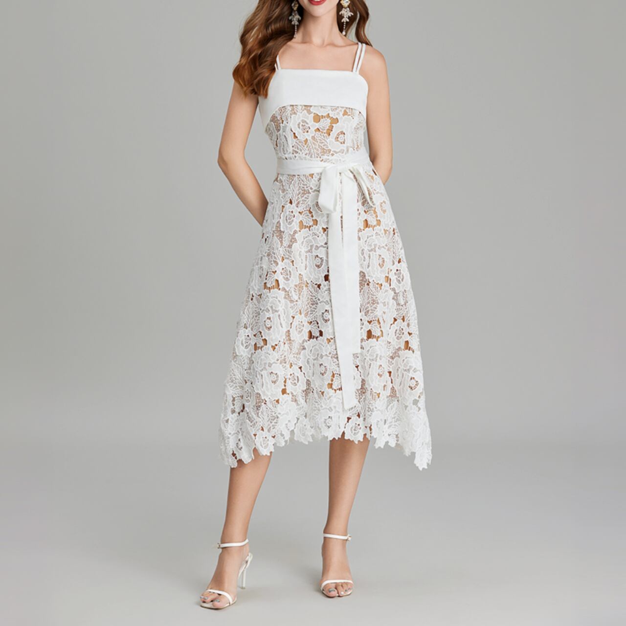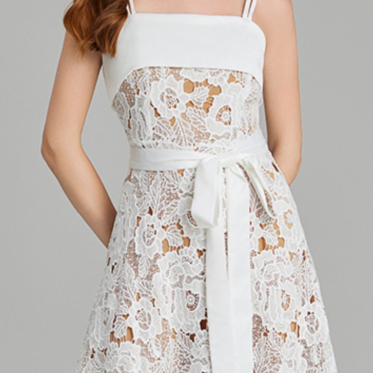 純白のキャミソールワンピースは、繊細な模様と腰回りのリボンの組み合わせが魅力。シンプルなデザインながら、存在感抜群。フォーマルな場にも、カジュアルな装いにも合わせやすいです。