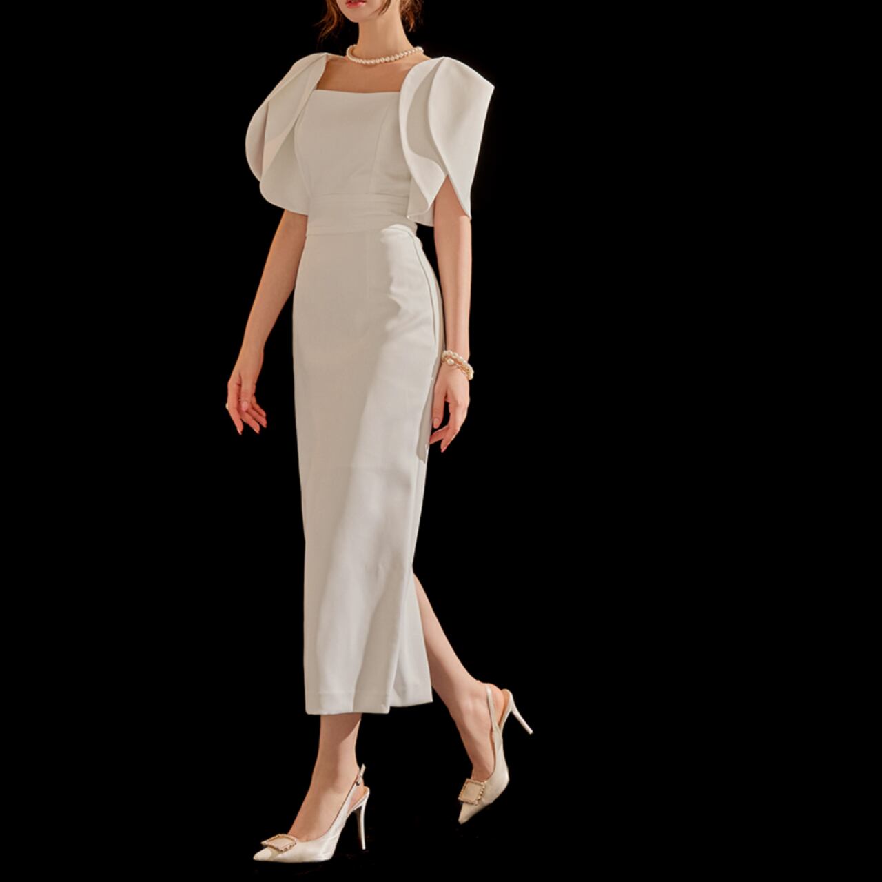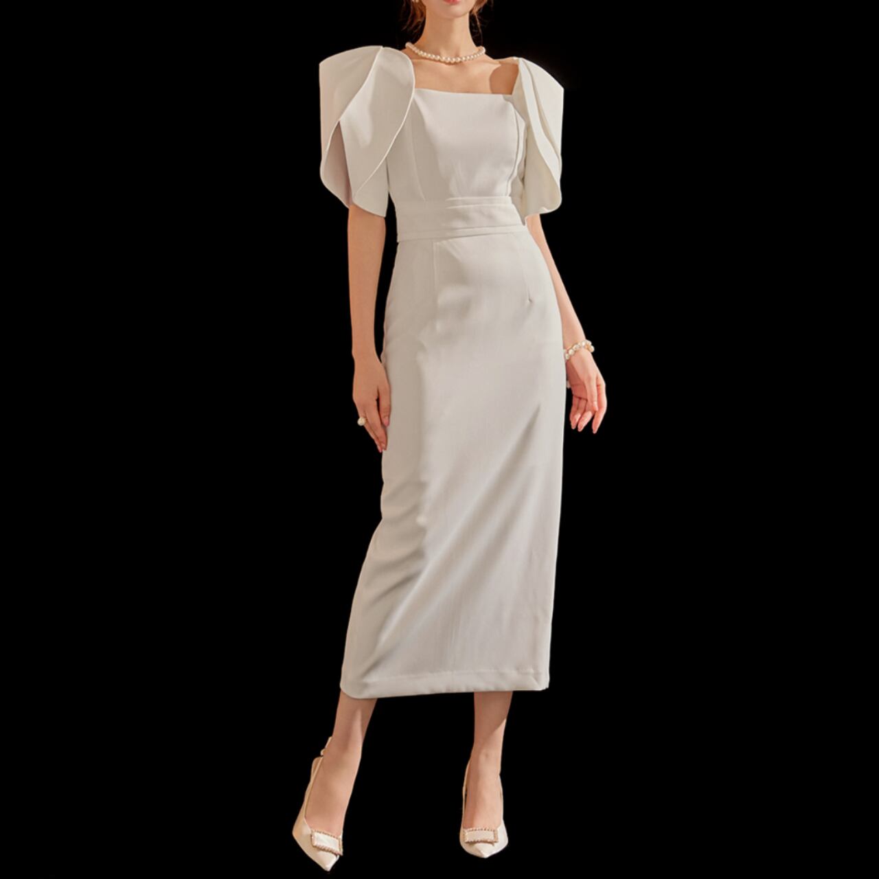 すっきりとしたスクエアネックと、ボリュームのあるパフスリーブが魅力的なタイトドレス。