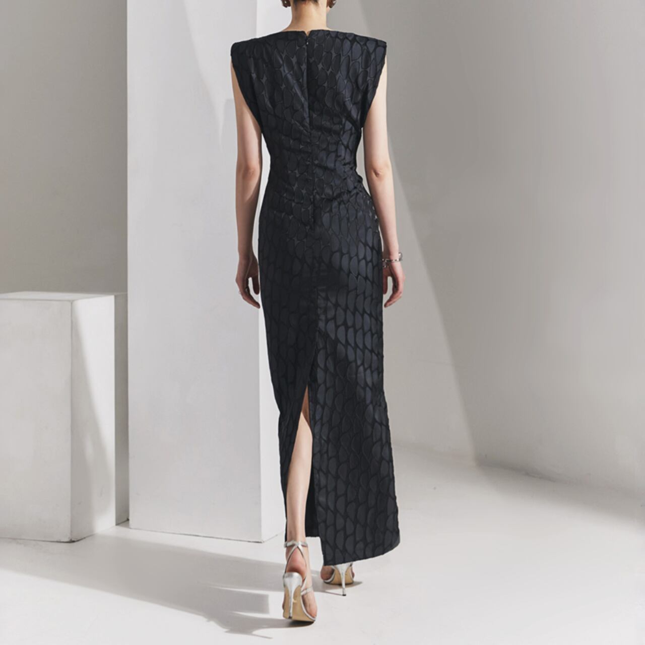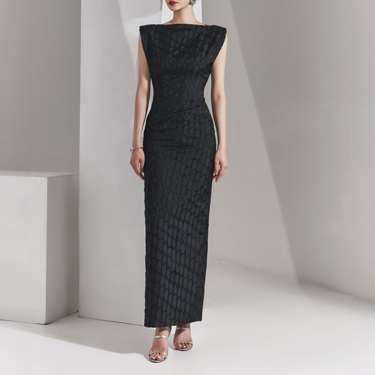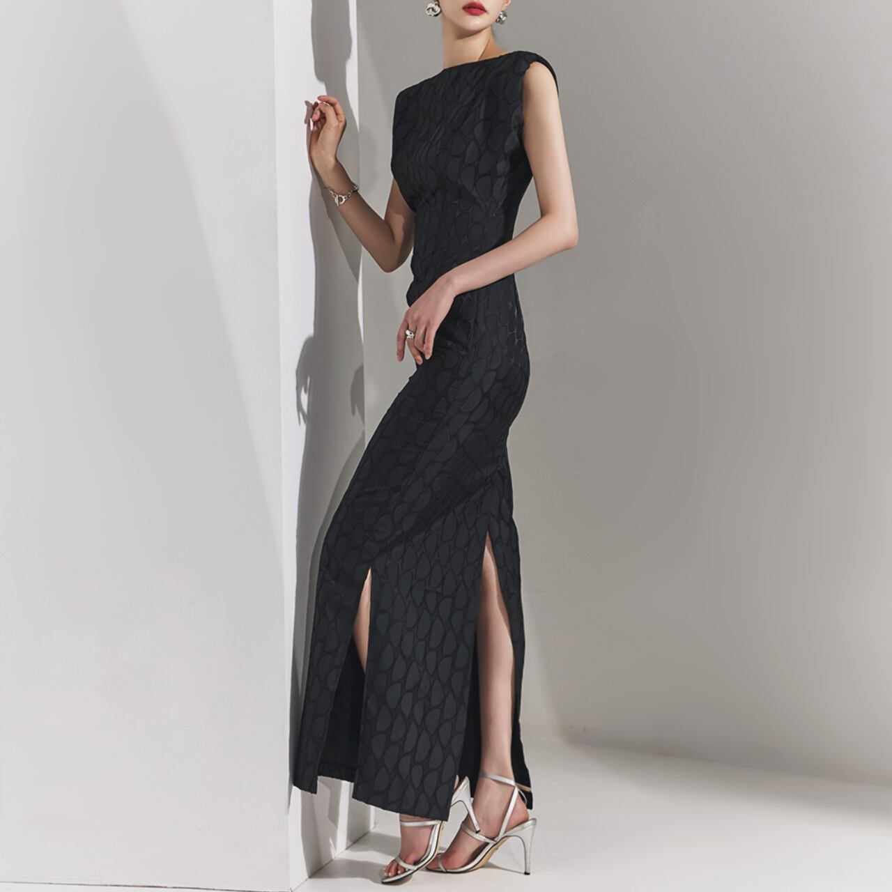 エレガントなブラックカラーが際立つ、ノースリーブロングドレス。