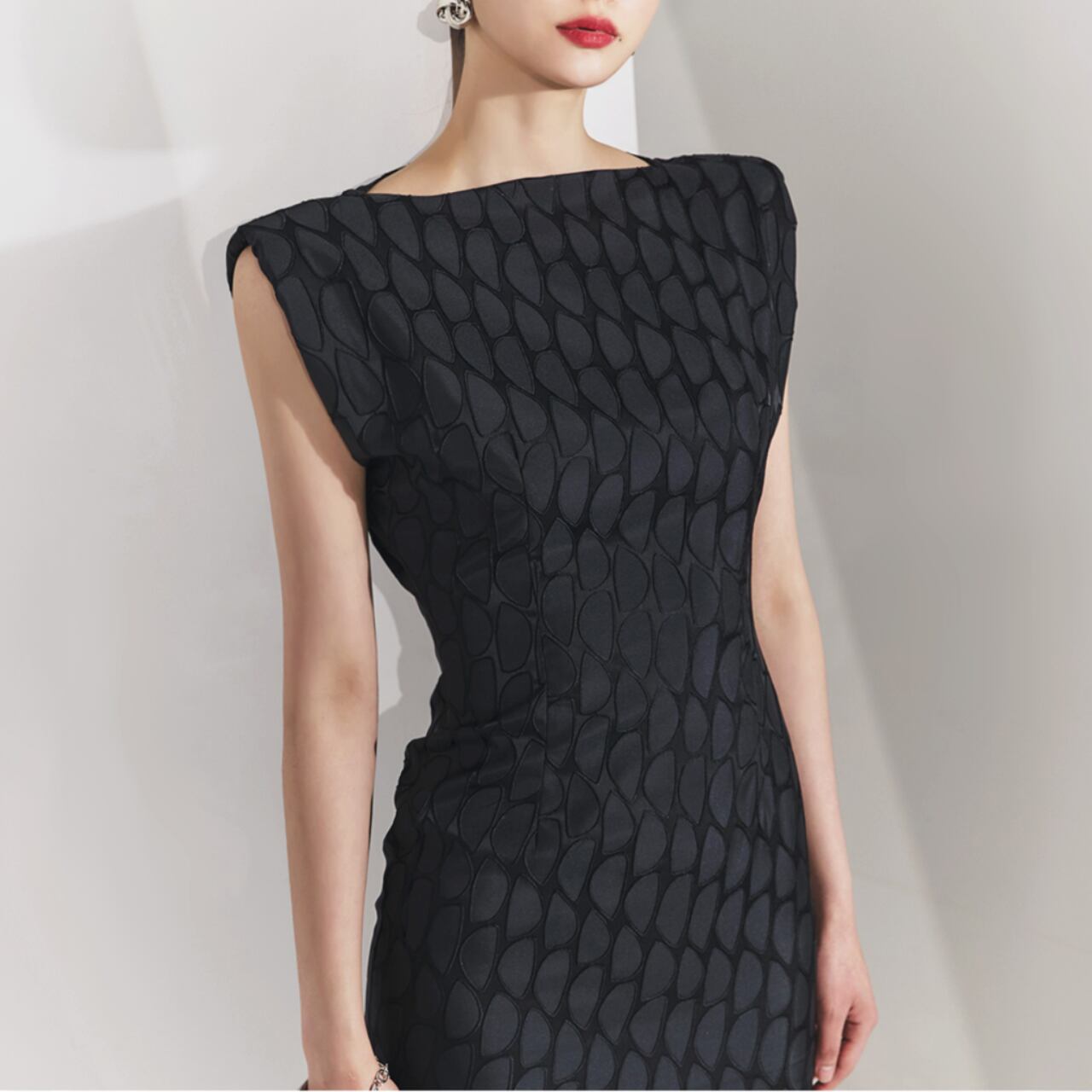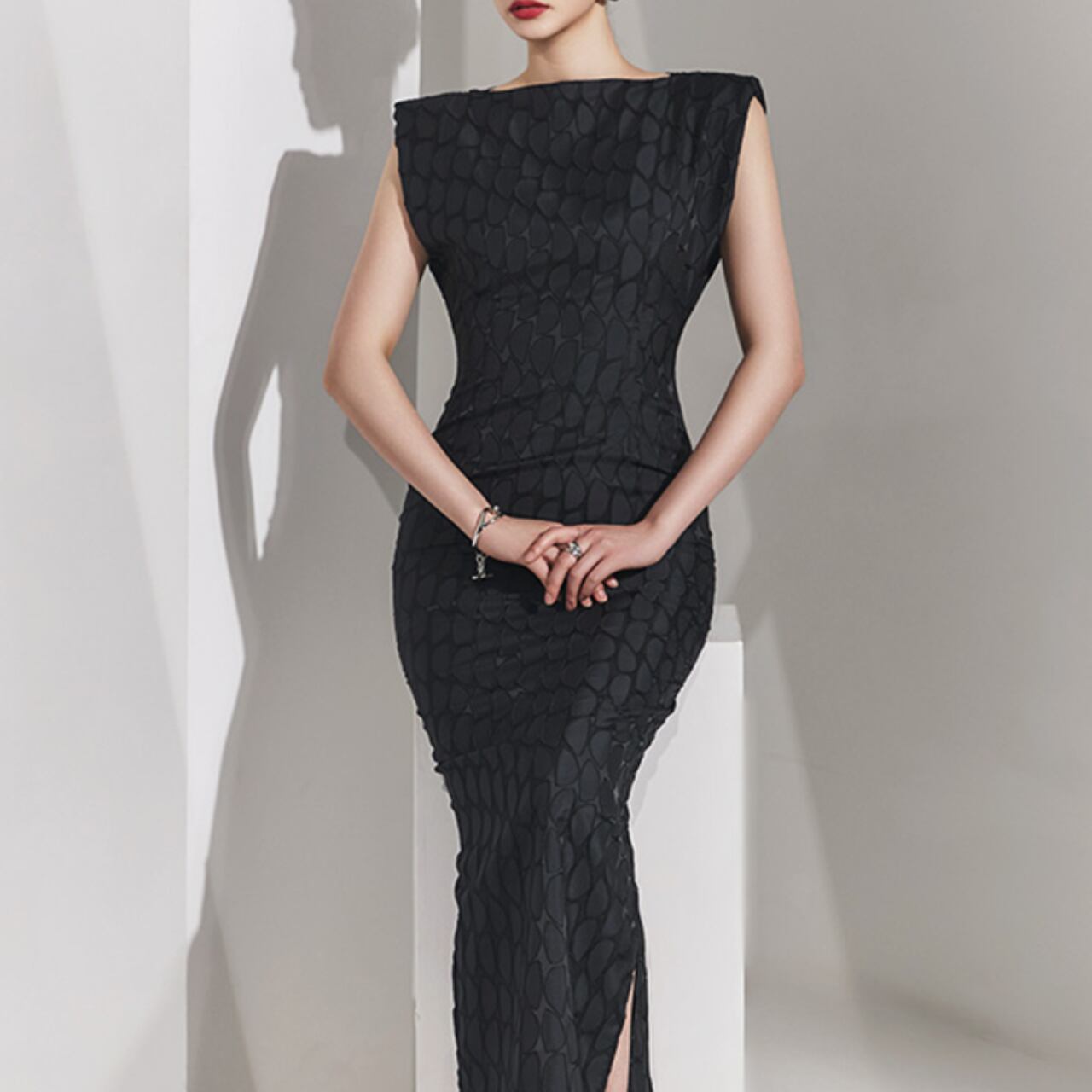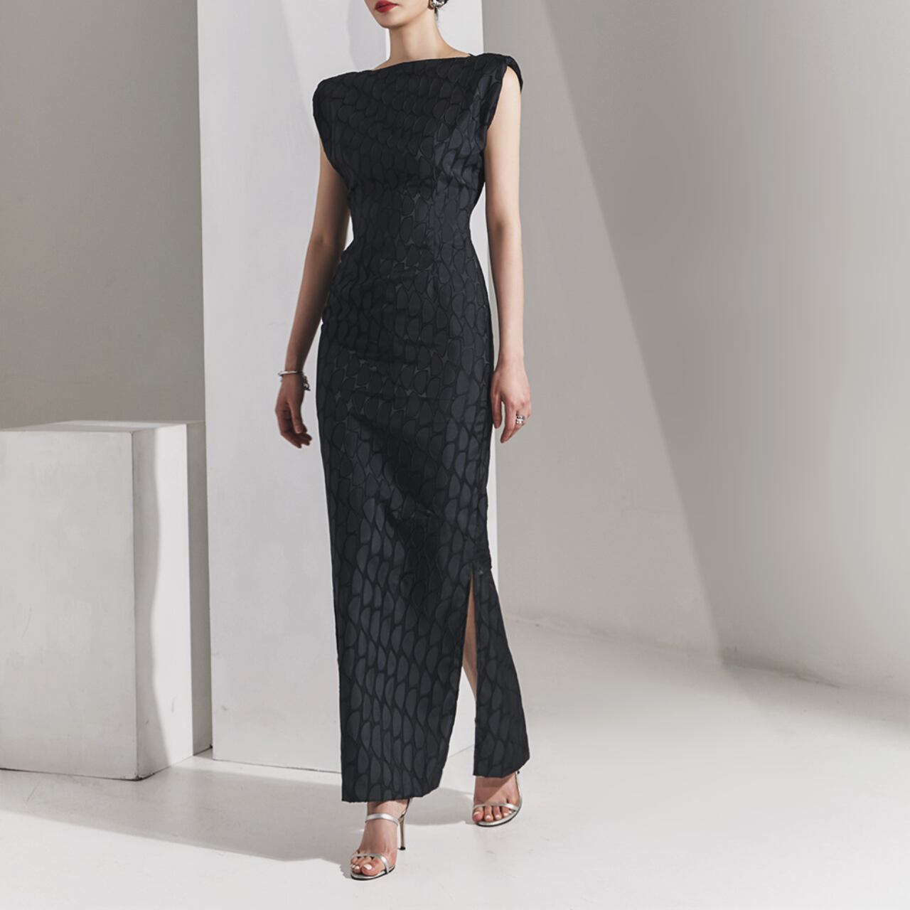 エレガントなブラックカラーが際立つ、ノースリーブロングドレス。